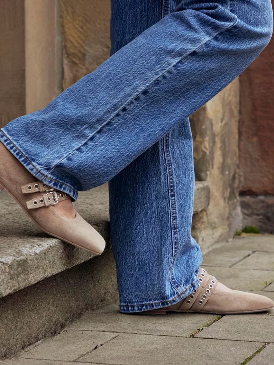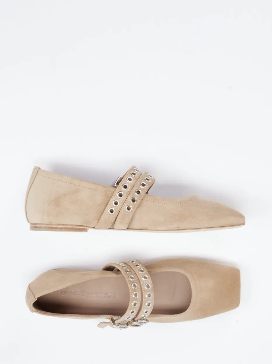 Minimalistische Silhouette, maximaler Stil.Kennel & Schmenger interpretiert bei dieser Mary-Jane-Ballerina-Kategorie klassische Form neu. Für Tage, an denen Komfort und Stil gefragt sind: Der spitz zulaufende Spangenpumps aus beigefarbenem Veloursleder überzeugt mit matt-texturierter Oberfläche, silberfarbenen Schnallen und doppelt geführten Riemen. Die eckige Kappe und das weit ausgeschnittene Dekolleté betonen den Fuß, während das Ziegenlederfutter und die durchgehende Ledersohle hohen Tragekomfort bieten. Das puristische Farbkonzept und die flache Silhouette machen das Modell zum perfekten Begleiter für Bürolooks und relaxed gestylte City-Looks mit Culottes oder weiter Jeans. Kennel & Schmenger liefert ein Statement-Piece mit klassischer Handschrift und Streetstyle-Attitüde.