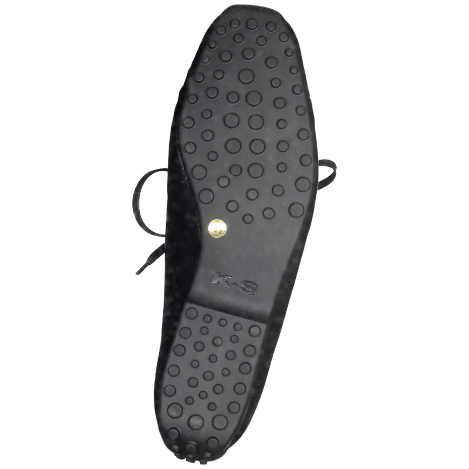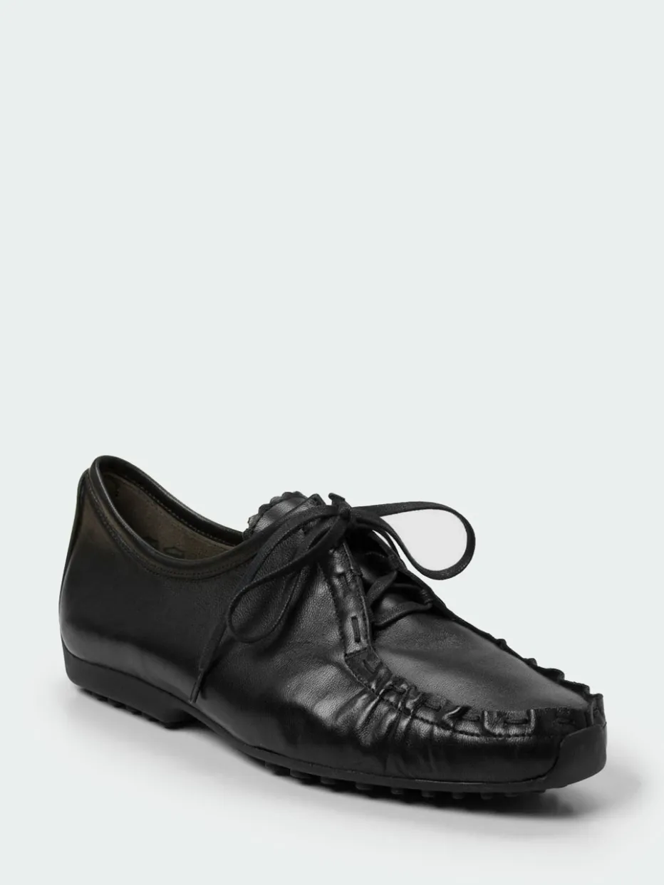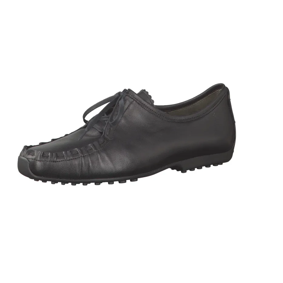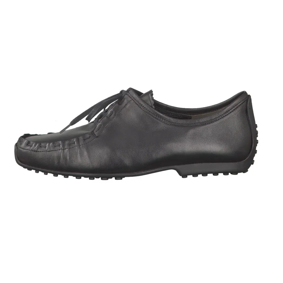 Einen hoch angeschlossenen, aber durchaus femininen Schnürschuh zeigt die Marke Kennel & Schmenger. Er besticht durch das besonders weiche, schwarze Kalbleder. Ein besonderes Detail ist die unkonventionelle Mokassinnaht, sie wirkt neu und vermittelt lässige Sportlichkeit. Die schwarze, genoppte Gummisohle ist im Stil der Autofahrersohlen an der Ferse hochgezogen. Absolute Bequemlichkeit ist eine Selbstverständlichkeit bei diesem Schnürschuh.