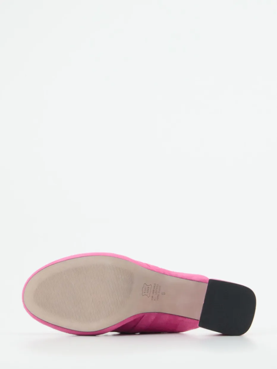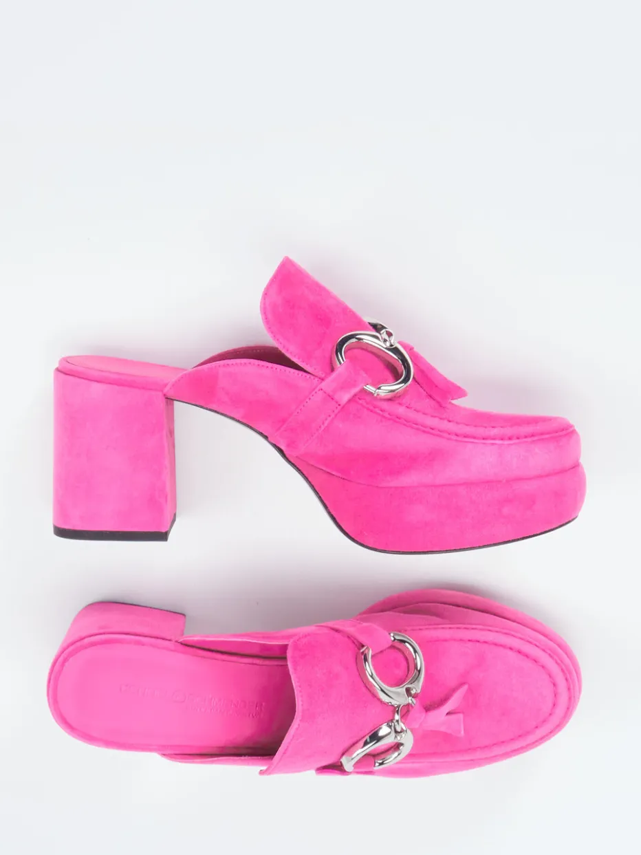 Ob zur Party oder auf der Straße – der hochmodische Look überzeugt auf ganzer Linie. Gefertigt aus pinkem Veloursleder mit samtig-matter Oberfläche und betonten Kanten trifft Retro auf Ausdrucksstärke. Die silberfarbene Schnalle mit herzförmiger Applikation und Quaste setzt verspielte Akzente im Y2K-Stil. Die lederbezogene Plateausohle mit Blockabsatz bietet sicheren Stand, während das Ziegenlederfutter und die profilierte Ledersohle für Komfort sorgen. Ideal kombinierbar mit Wide-Leg-Jeans oder Metallic-Accessoires.