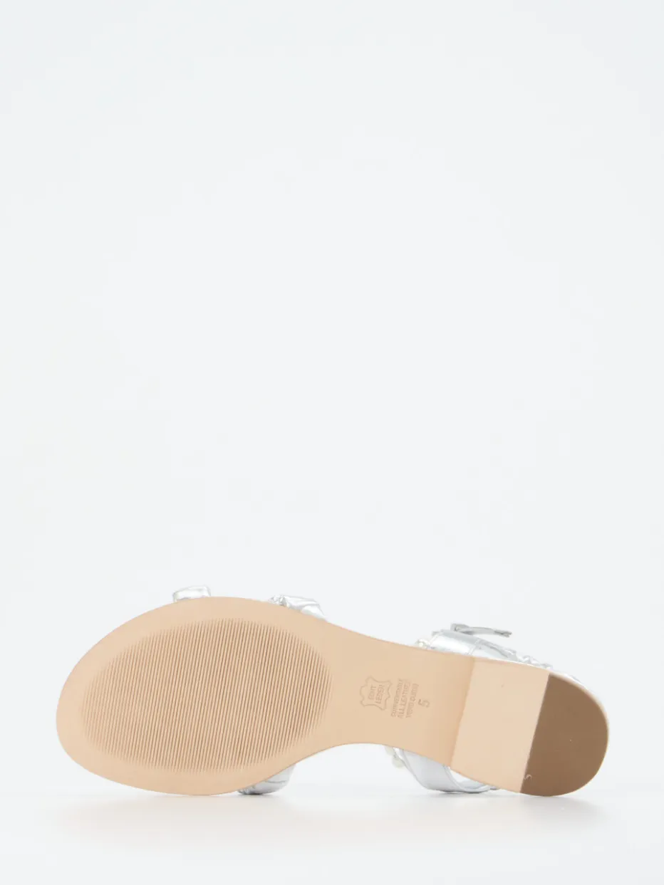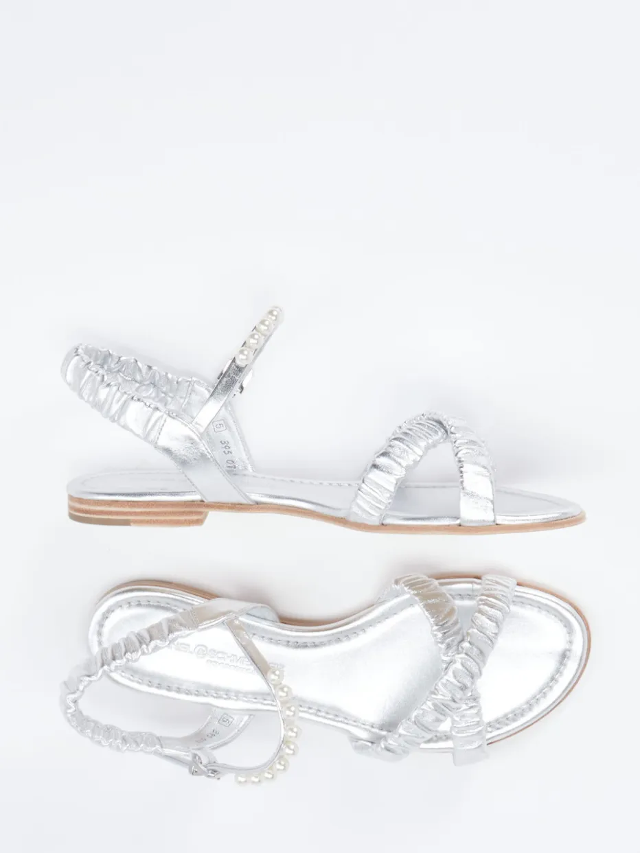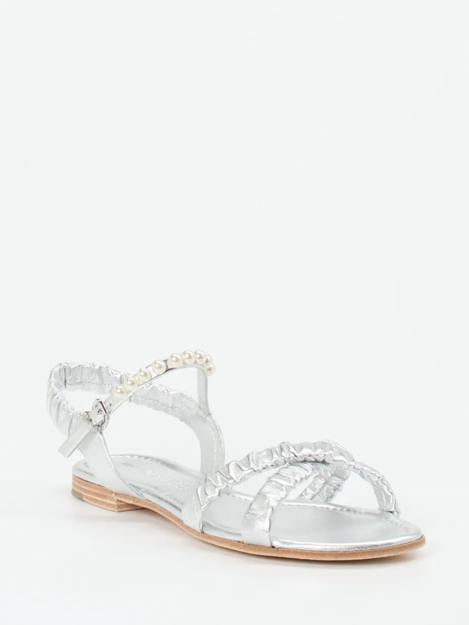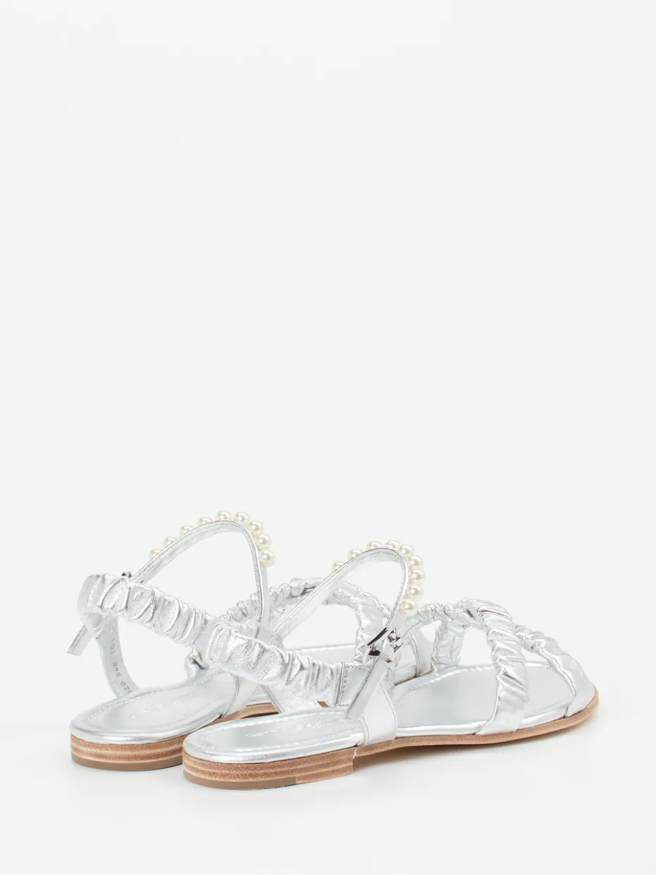 Ideal für festliche Anlässe oder den stilvollen Strandspaziergang überzeugt das Modell durch hochwertiges Metallicleder in silbernem Schimmer. Leicht geraffte Riemchen und ein Perlenbesatz setzen romantische Akzente. Der offene, flache Aufbau bietet luftigen Komfort, unterstützt durch eine weich gepolsterte Ledersohle. Fersen- und Knöchelriemen mit silberfarbener Dornschließe sorgen für sicheren Halt. Im Trend liegen Metallic-Akzente und Perlverzierungen gleichermaßen. Lässt sich perfekt zu pastellfarbenen Sommerkleidern oder Metallic-Accessoires kombinieren.