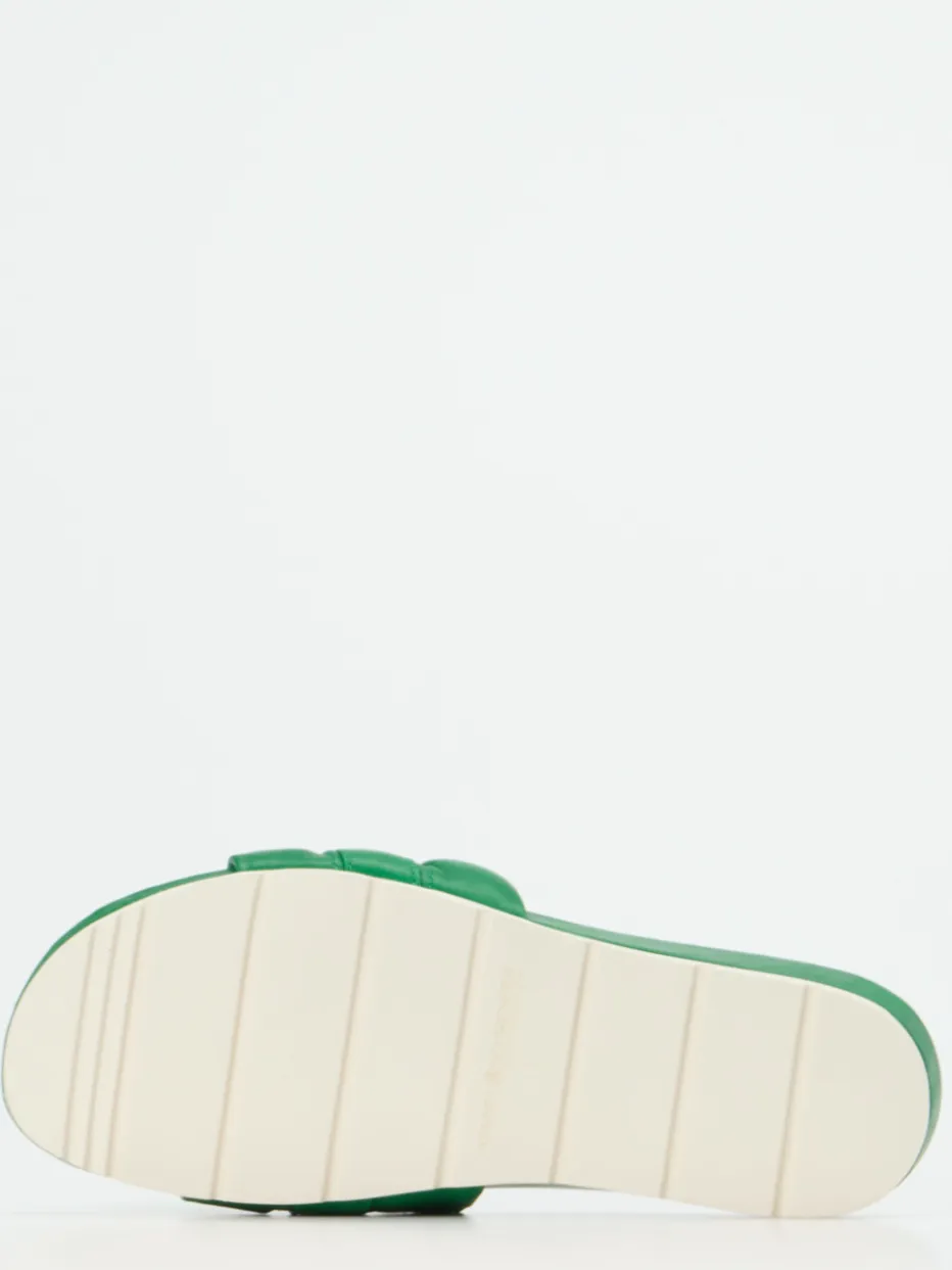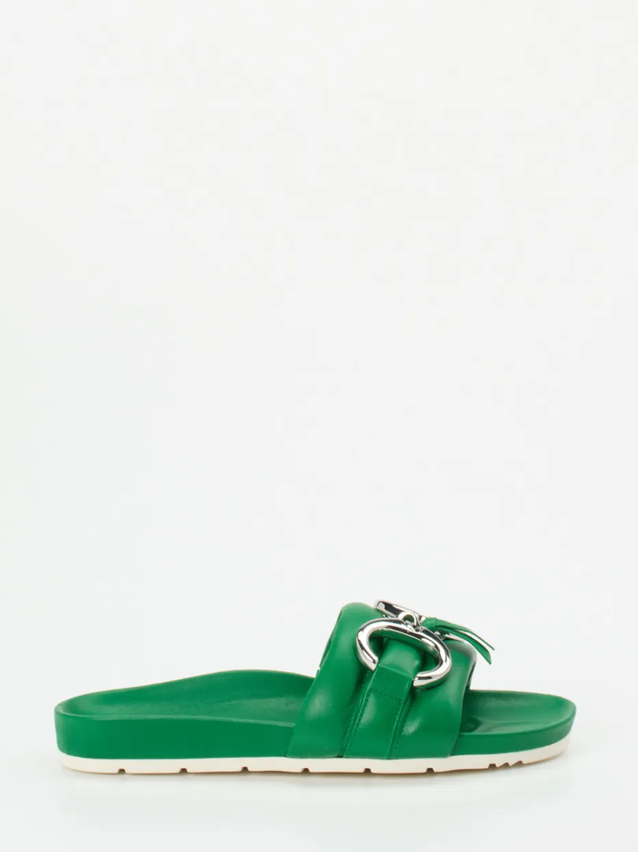 Diese Pantolette vereint hochwertigen Komfort mit einem modischen Statement – das smaragdgrüne Lammleder und die silberne Zierschnalle unterstreichen einen urbanen Sommerstil.