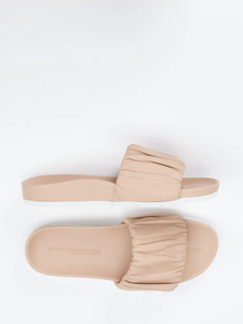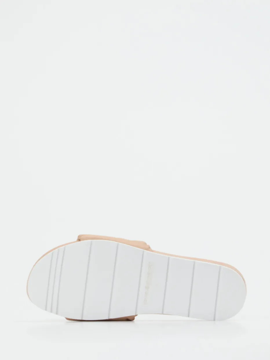 Perfekt für entspannte Sommertage in der Stadt, bieten diese beigefarbenen Slides aus feinem Lammleder angenehme Haptik und hohen Tragekomfort. Der voluminös geraffte, gepolsterte Riemen akzentuiert die schlichte, offene Silhouette mit modischer Leichtigkeit. Die weiße, profilierte Gummisohle sorgt für sicheren Halt – selbst auf glatten Oberflächen. Inspiriert vom „Quiet Luxury“-Trend passen sie ideal zu Leinenhosen oder Denim-Shorts.