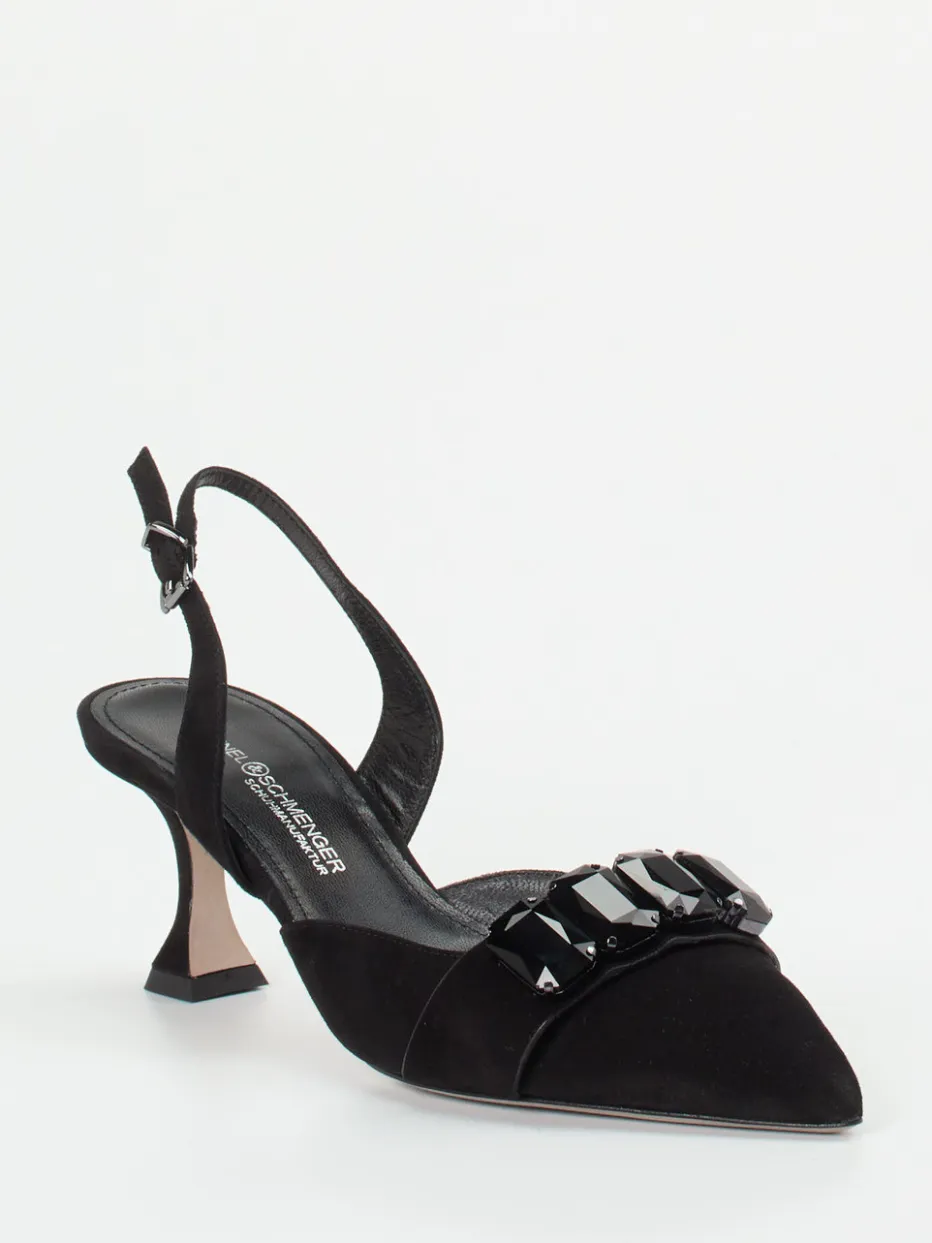 Funkelnder Akzent für formelle Anlässe.Kennel & Schmenger präsentiert stilvolle Slingback-Pumps in edlem Schwarz. Diese Pumps eignen sich ideal für festliche Events und gehobene Abendveranstaltungen. Das feine Veloursleder zeigt sich samtig-matt, während große, facettierte Schmucksteine auf dem Vorderblatt elegante Glanzpunkte setzen. Die spitz zulaufende Silhouette, ein verstellbares Fersenriemchen mit filigraner Schnalle und der skulpturale, lederbezogene Absatz vereinen Funktion und Design. Die Kombination aus zeitloser Farbe und ornamentalem Detail orientiert sich an Quiet Luxury und 90er-Jahre-Ästhetik. Besonders harmonisch wirkt der Look zu einer cremefarbenen Seidenbluse. Hochwertige Verarbeitung und raffinierte Gestaltung in kennzeichnender Markenhandschrift.