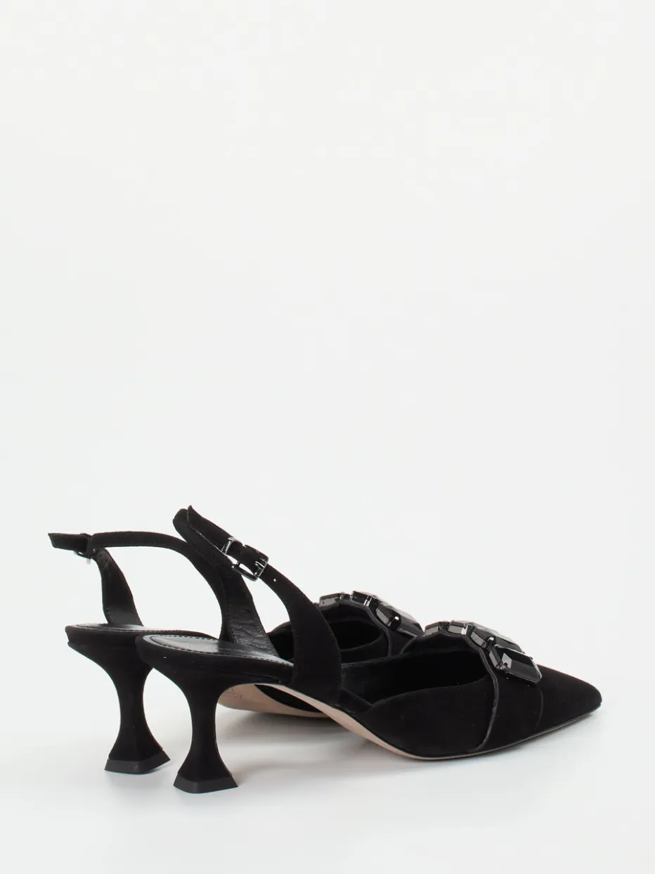 Samtig schwarzes Veloursleder und funkelnde Schmuckdetails vereinen sich zu einem eleganten Auftritt mit Vintage-Charme. Ideal für Abendveranstaltungen mit Anspruch an Stil und Komfort.