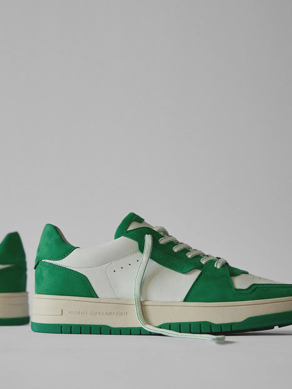 Dieser Sneaker kombiniert hochwertiges Kalbleder mit Veloursleder-Einsätzen in einem frischen Grün-Weiß-Kontrast – ideal für trendorientierte Streetwear-Ensembles.
