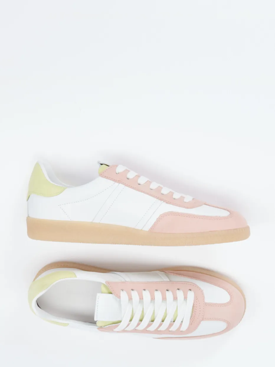 Ob beim Stadtbummel oder auf dem Weg ins Café: Die Kombination aus weißem Kalbleder und soft angeschliffenem Nubukleder in Rosé und Pastellgelb wirkt stilvoll und trendbewusst zugleich. Die klassische, flache Silhouette, dezente Ton-in-Ton-Nähte und farbige Overlays betonen den Retro-Charakter. Eine gepolsterte Ferse sorgt für angenehmen Komfort, die profilierte Gummisohle bietet sicheren Halt. Der Look ist ideal für das Y2K-Revival und passt zu neutralen Tönen sowie weiten Hosen und Crossbody-Bags in Pastell.