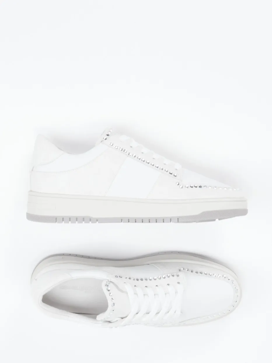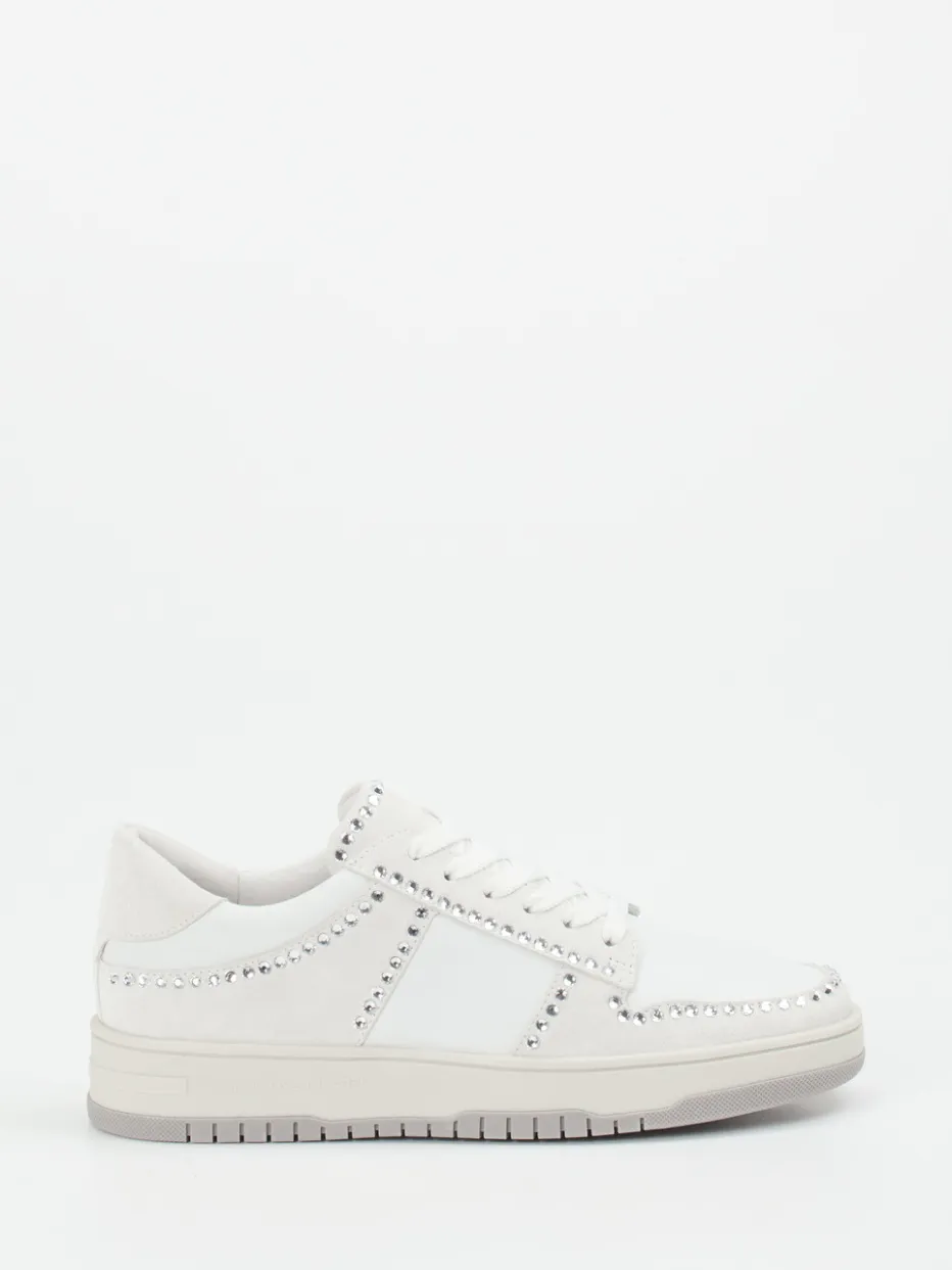 Ideal für entspannte City-Tage oder den stilvollen Auftritt im Urlaub: Dieser Sneaker überzeugt durch einen hochwertigen Materialmix aus Kalbleder und samtig angeschliffenem Veloursleder. Das Design in Off-White mit hellgrauen Nuancen wirkt zurückhaltend und edel, während der umlaufende Strassbesatz entlang der klassischen Silhouette dezente Eyecatcher setzt. Die profilierte Gummisohle mit Markenprägung sorgt für Trittsicherheit und einen sportiven Akzent. Inspiriert vom Minimalismus und aktuellen Crystal-Trends lässt sich der Look bestens zu weißen Jeans oder Pastelltönen kombinieren.