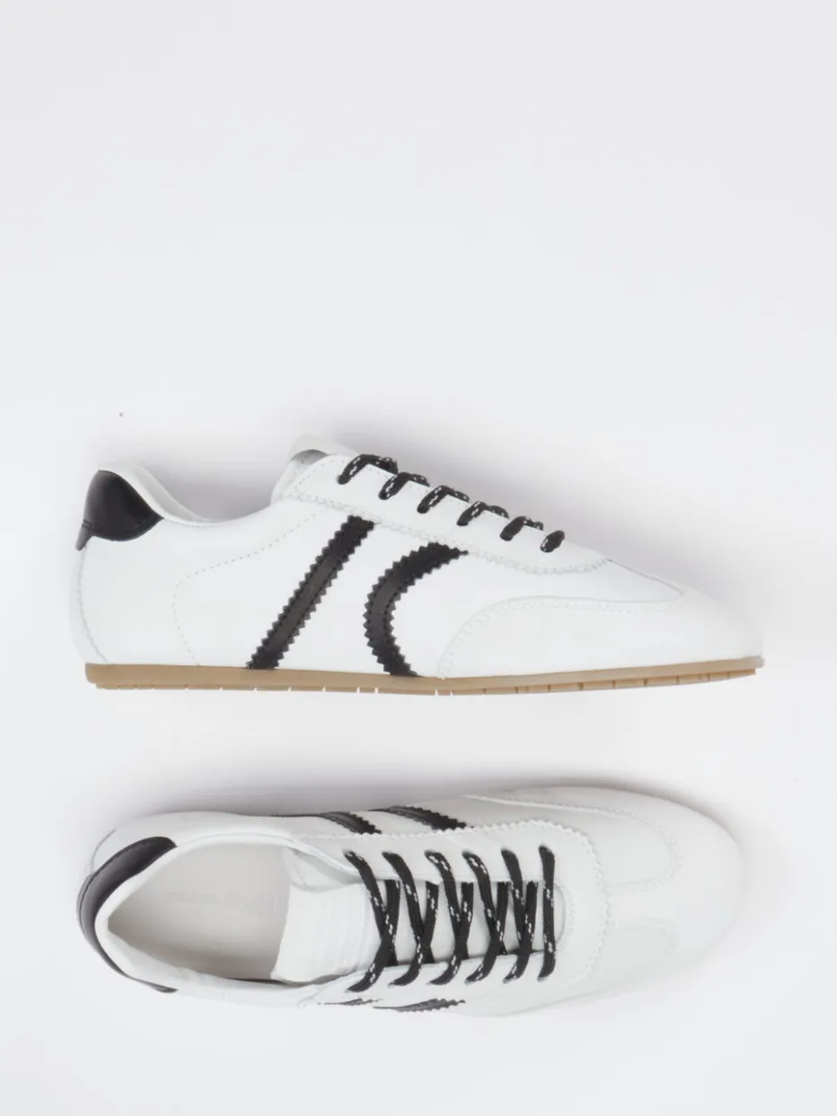 Retro trifft Streetstyle modern interpretiert. Kennel & Schmenger präsentiert einen modischen Sneaker für Damen mit markantem Retro-Charakter. Ideal für entspannte Citytrips oder den stilvollen Freizeit-Look: Das Modell präsentiert sich in einem spannenden Mix aus Velours- und Glattleder mit glänzender wie velouriger Oberfläche. Die weiße Grundfarbe wird durch schwarze Kontrastelemente akzentuiert – darunter Zickzack-Streifen, Schnürsenkel und Fersenkappe. Die flache, schmale Silhouette sowie die leichte Gummisohle sorgen für Komfort und Leichtigkeit. Deutliche Streetwear-Anklänge machen den Sneaker zum Trendpiece der Saison. Ein stilbewusster Begleiter mit Vintage-Note und urbaner Vielseitigkeit.