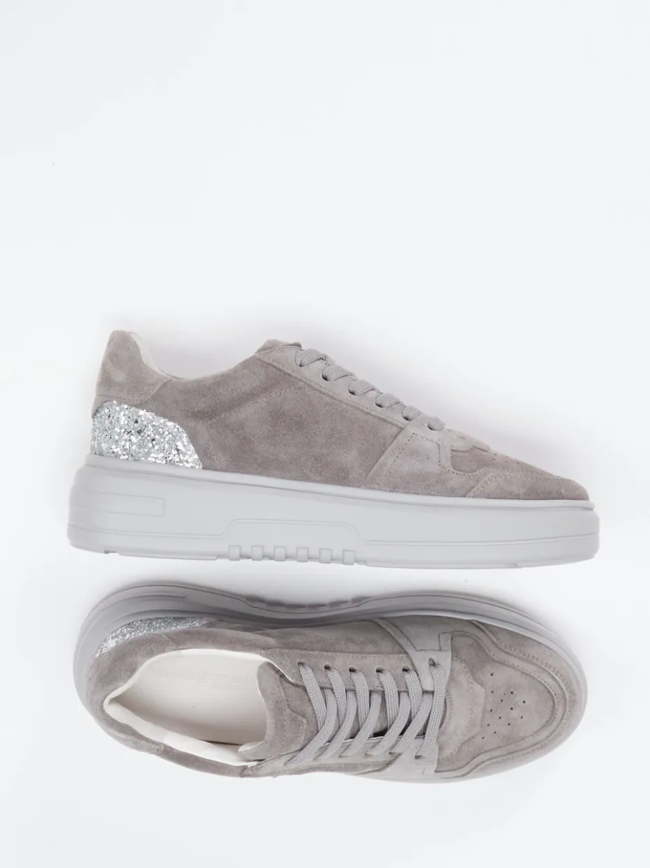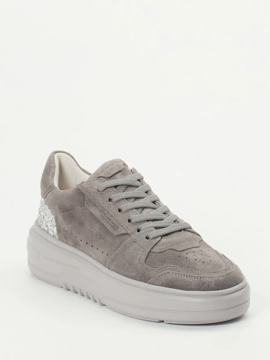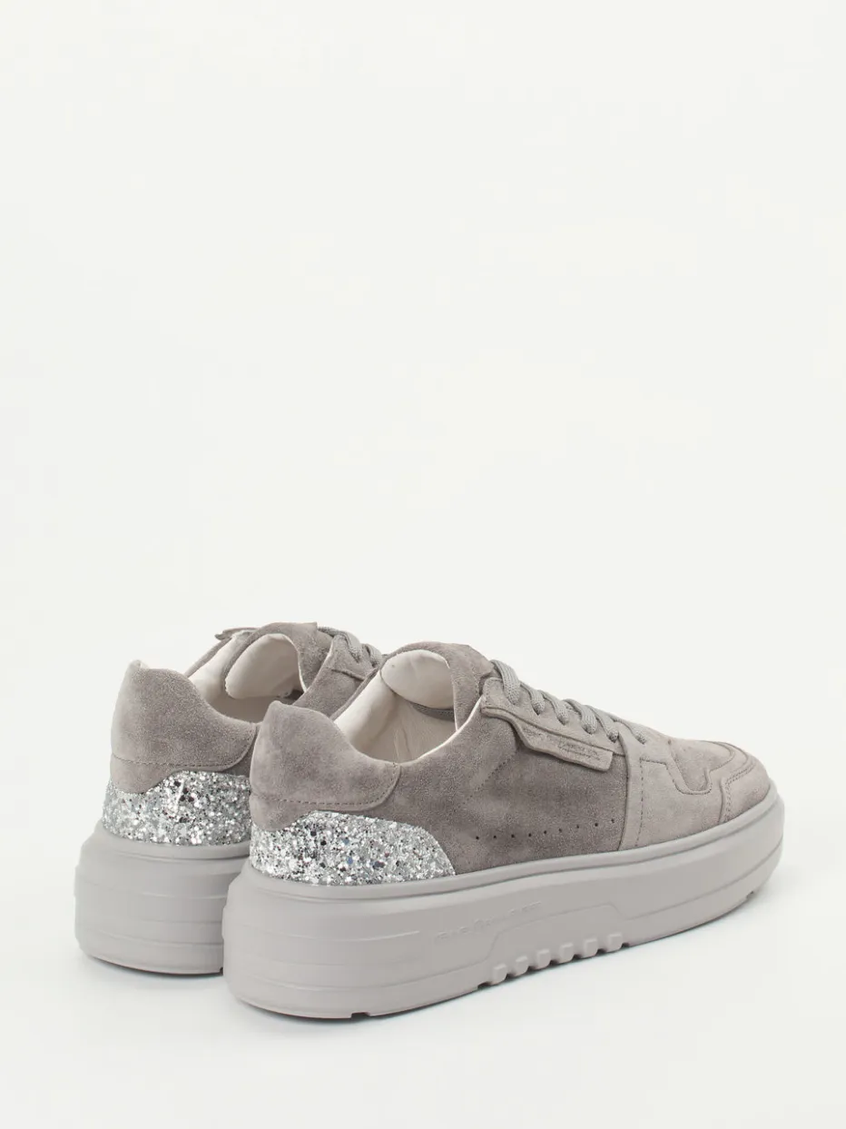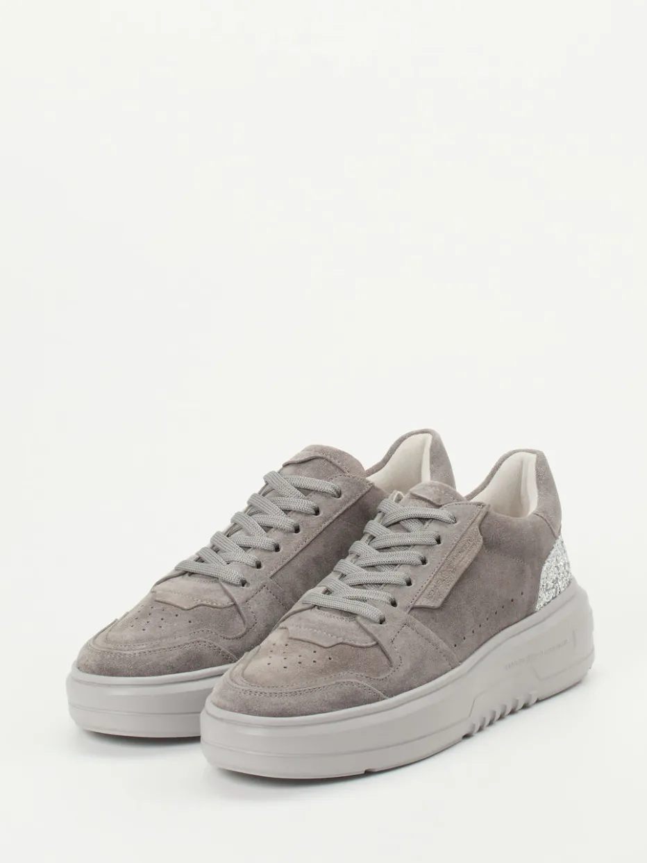 Für stilbewusste Freizeitmomente überzeugt das Modell durch samtig angeschliffenes Veloursleder in verschiedenen Graunuancen. Die klassische Rundform und eine tonige Plateausohle verleihen einen sportiven Look, während der silberfarbene Glitzerbesatz an der Ferse zum Eyecatcher wird. Perforationen und ein gepolstertes Leder-Wechselfußbett bieten komfortable Details. Der Stil orientiert sich an aktueller „Quiet Luxury“-Ästhetik mit femininer Note und lässt sich ideal mit Oversize-Hoodies oder Metallic-Accessoires kombinieren.