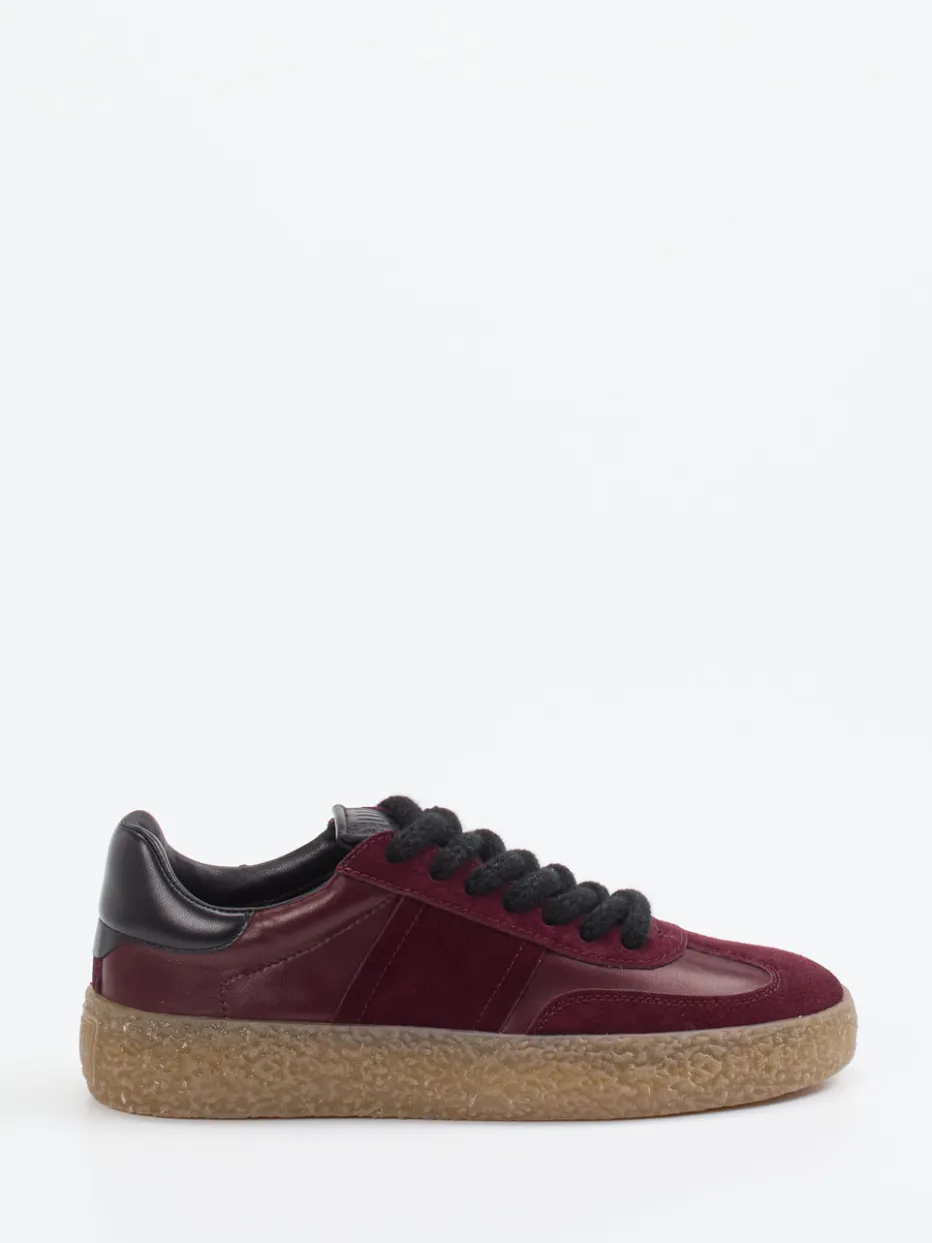Ob zum Stadtbummel oder für stylishe Abende – der Sneaker überzeugt mit einer Kombination aus samtigem Velours- und glattem Leder. Die Ton-in-Ton-Nähte und die strukturierte Kreppsohle setzen markante Akzente zum bordeauxroten Obermaterial. Der gepolsterte Einstieg und das hochwertige Lederfutter sorgen für Komfort im Alltagslook. Der Schnürverschluss mit auffälligen schwarzen Bändern unterstreicht die retro-inspirierte Silhouette im Low-Top-Stil. Optimal kombinierbar mit Cordhose oder Oversized Hoodie.