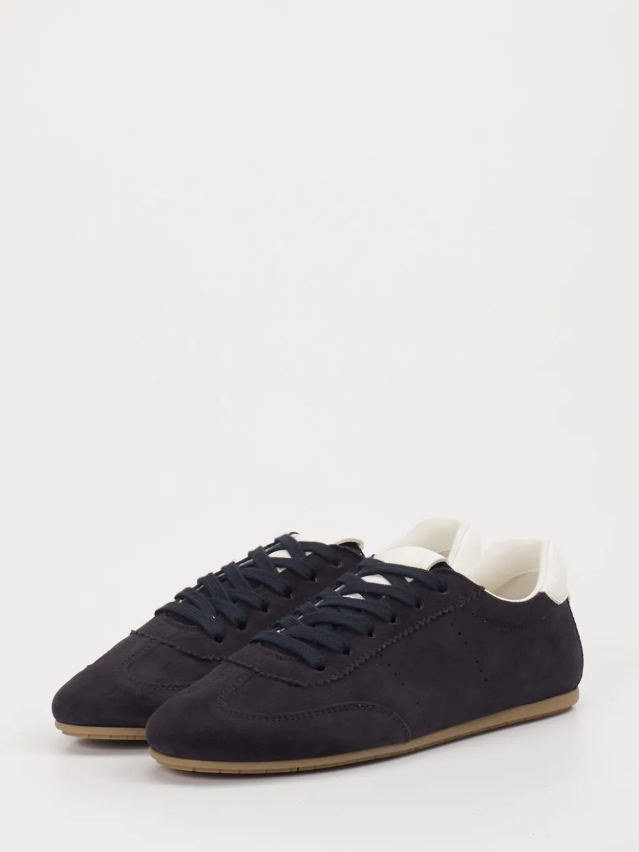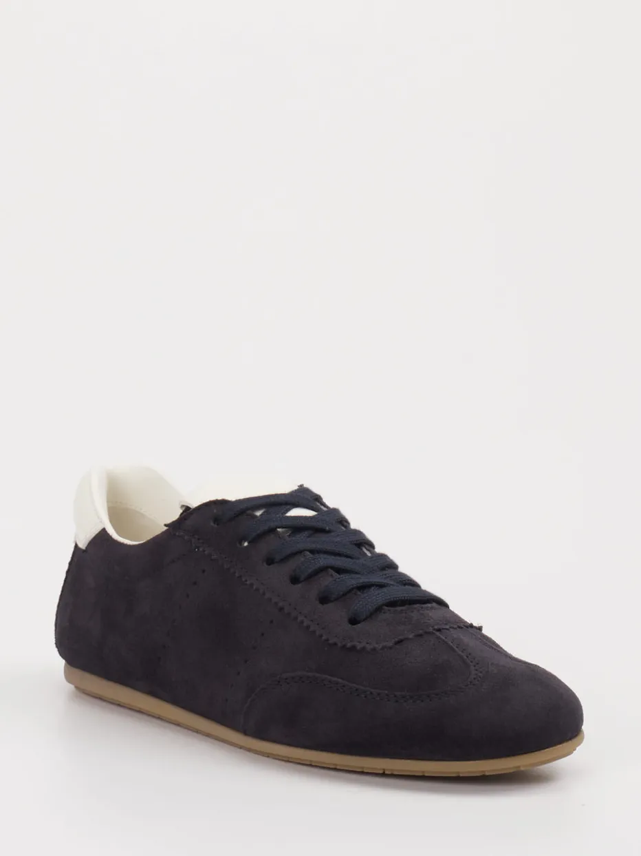 Schlichte Raffinesse im Retro-Stil. Kennel & Schmenger präsentiert einen Low-Top-Sneaker für Damen aus feinem Veloursleder. Für entspannte Alltagsmomente bietet dieses Modell Komfort und Stil zugleich. Der dunkelblaue Oberaufbau aus samtigem Veloursleder steht im stilvollen Kontrast zum Fersenbesatz in Offwhite. Die schmal zulaufende Silhouette und das betont reduzierte Design spiegeln Einflüsse der Retro Sportswear und des Minimalismus wider. Innen sorgt ein Futter aus Ziegenleder für angenehmes Tragegefühl, während die flache Gummisohle Alltagstauglichkeit verspricht. Besonders harmonisch zu entspannten Casual-Looks oder monochromen Outfits. Ein Statement für Understatement – kennzeichnend für die stilistische Klarheit der Marke.