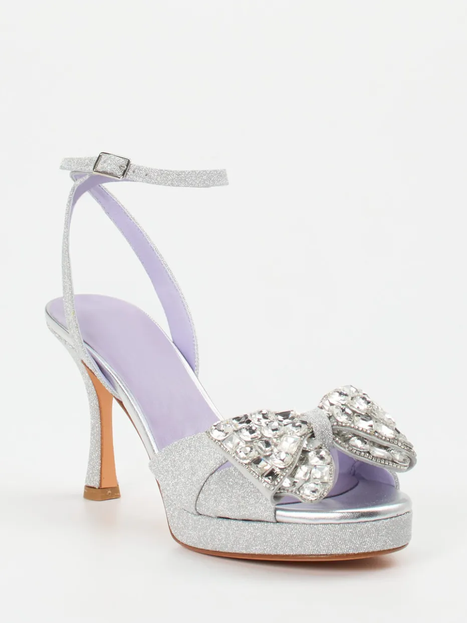 Silbernes Metallicleder trifft auf funkelnde Strassdetails – diese Abendsandale vereint feminine Eleganz mit einem Hauch von Y2K-Glamour.