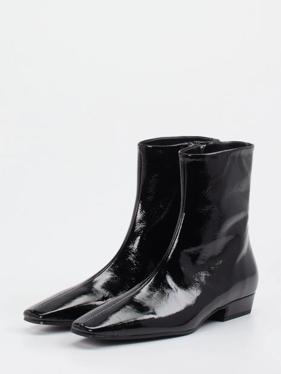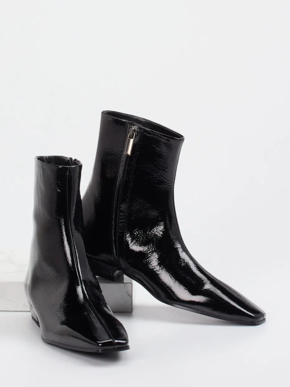 Diese Ankle Boots verbinden minimalistisches Design mit einem glänzenden Lack-Finish – klar konturiert, urban und stilbewusst.