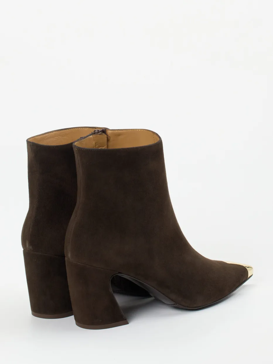 Die goldfarbene Metallspitze sorgt für ein edles Statement und verleiht dem weich strukturierten Veloursleder eine raffinierte Note im ‚Quiet Luxury‘-Stil.