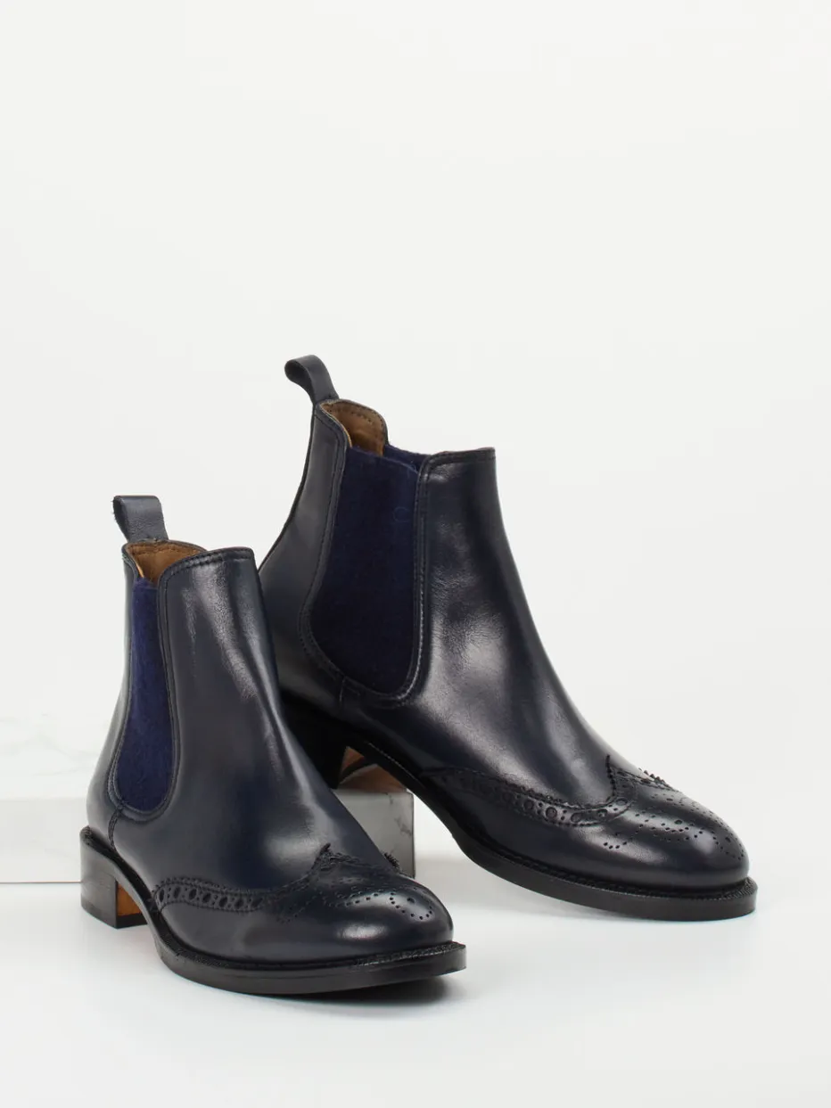 Klassik trifft Quiet Luxury.Konstantin Starke interpretiert den Chelsea Boot im hochwertigen Kalbleder für Damen. Elegant und zugleich modern zeigt sich das tiefblaue Modell mit glänzender Oberfläche, Flügelkappe und präziser Broguing-Lochmusterung. Seitliche Elastikeinsätze in Flanelloptik, handwerkliche Ziernähte und eine klassische Zuglasche sorgen für Komfort und Formtreue. Die profilierte Leder-Gummisohle bietet sicheren Halt und unterstreicht den Heritage-inspirierten, zeitlosen Stil. Perfekt zu Business-Looks oder schmal geschnittener Wollhose. Feine Verarbeitung und dezente Details – ein Inbegriff moderner Klassik à la Konstantin Starke.