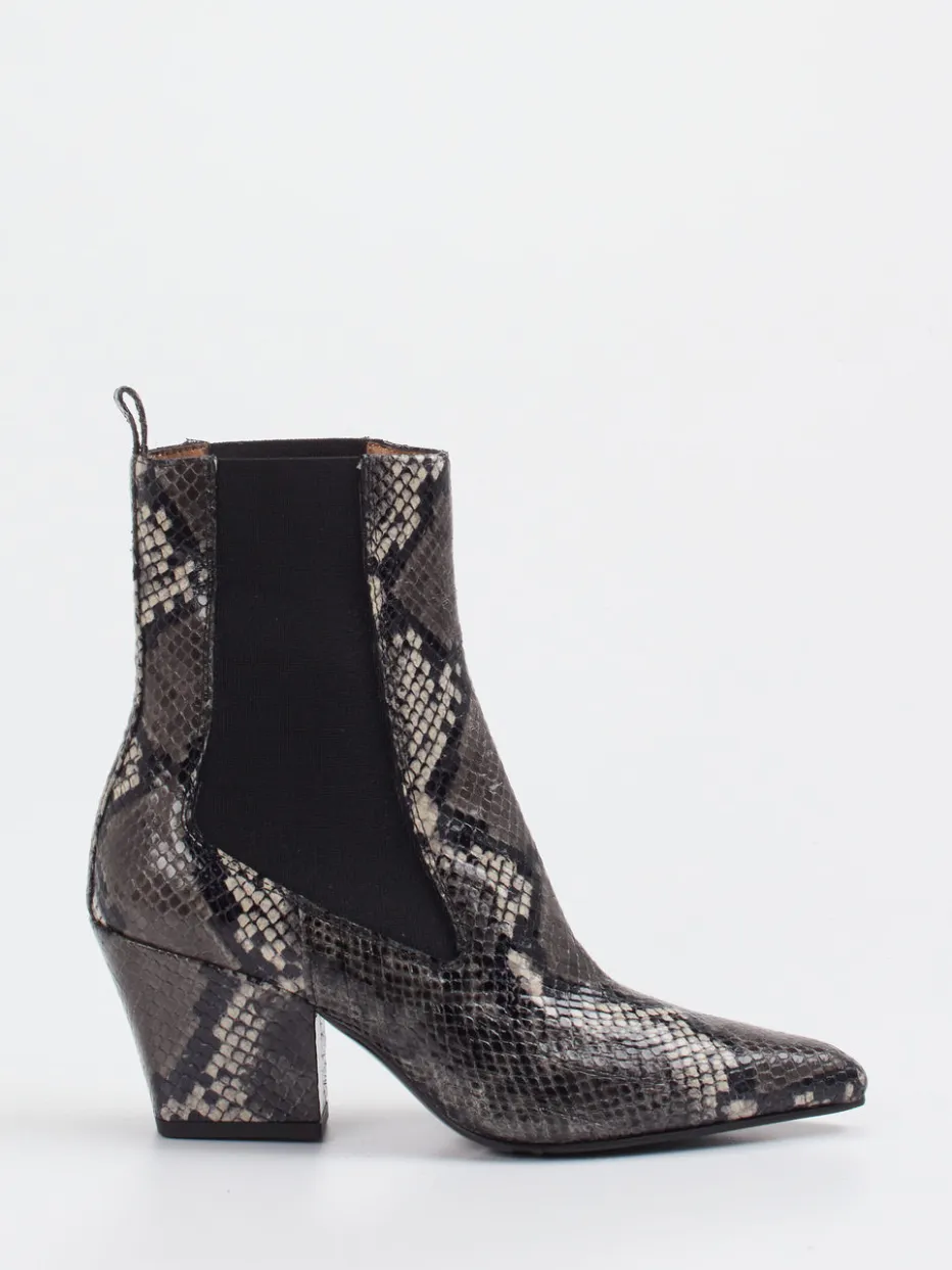Für stilbewusste Auftritte im urbanen Alltag oder zum Ausgehen bietet das Modell aus glänzendem Lammleder in realistisch geprägter Schlangenhautoptik einen markanten Look. Die tonalen Elasteinsätze und der 6 cm hohe Trichterabsatz betonen die spitz zulaufende Form und sorgen für bequemes An- und Ausziehen. Die anthrazitgraue Farbgebung mit Kontrasten in Beige und Schwarz ergänzt vielseitige Outfits. Kombiniert mit Skinny Jeans oder Oversize-Blazer entsteht ein moderner Western-Vibe – ideal für trendorientierte Styles.