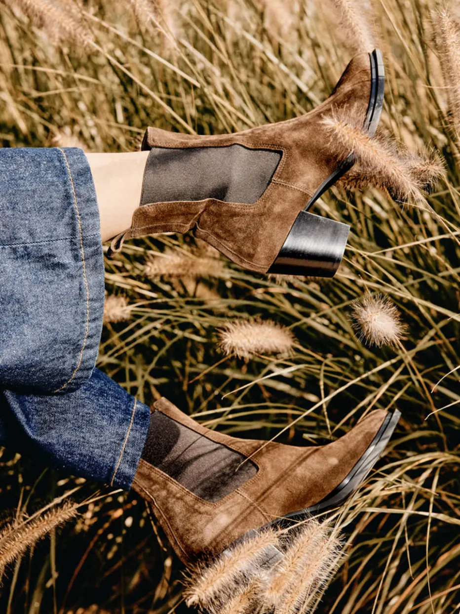 Ideal bei geschäftigen Tagen im Büro oder entspannten Herbstspaziergängen überzeugt das Modell durch hochwertiges Veloursleder, samtig matt angeschliffen. Die mittelbraune Farbgebung trifft auf schwarze Elasteinsätze, klare Linien und eine spitz zulaufende Front. Der betonte Blockabsatz in 5,5 cm Höhe und die praktischen Zuglaschen unterstreichen das stilvolle Design mit Alltagstauglichkeit. Ein modischer Look im Zeichen von ‚Quiet Luxury‘ – unkompliziert kombinierbar mit Denim oder Kaschmir.