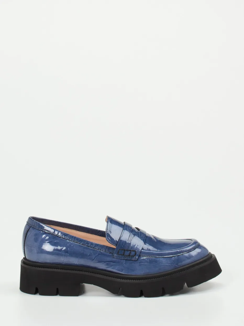 Dieser modische Loafer aus hochglänzendem Lackleder kombiniert klassische Preppy-Details mit urbaner Chunky-Sohle. Ideal für trendaffine Stil-Statements.