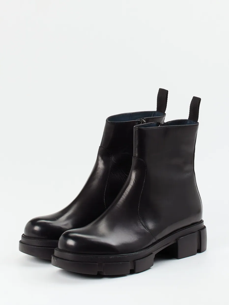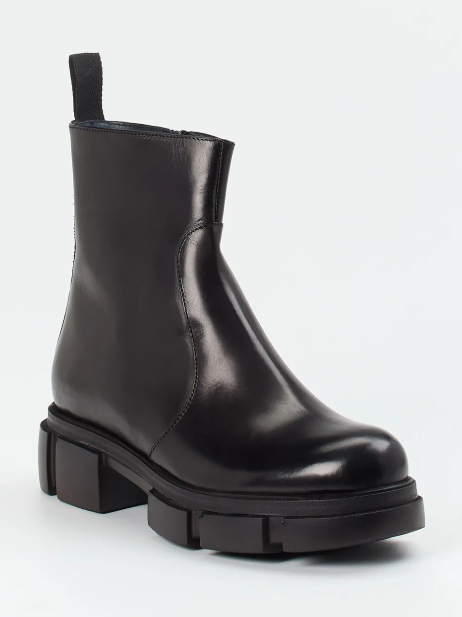 Diese Chunky-Stiefelette verbindet glänzend schwarzes Kalbleder mit klarer Formsprache und markanter Profilsohle – ein stilbewusstes Statement im Zeichen urbaner Eleganz.
