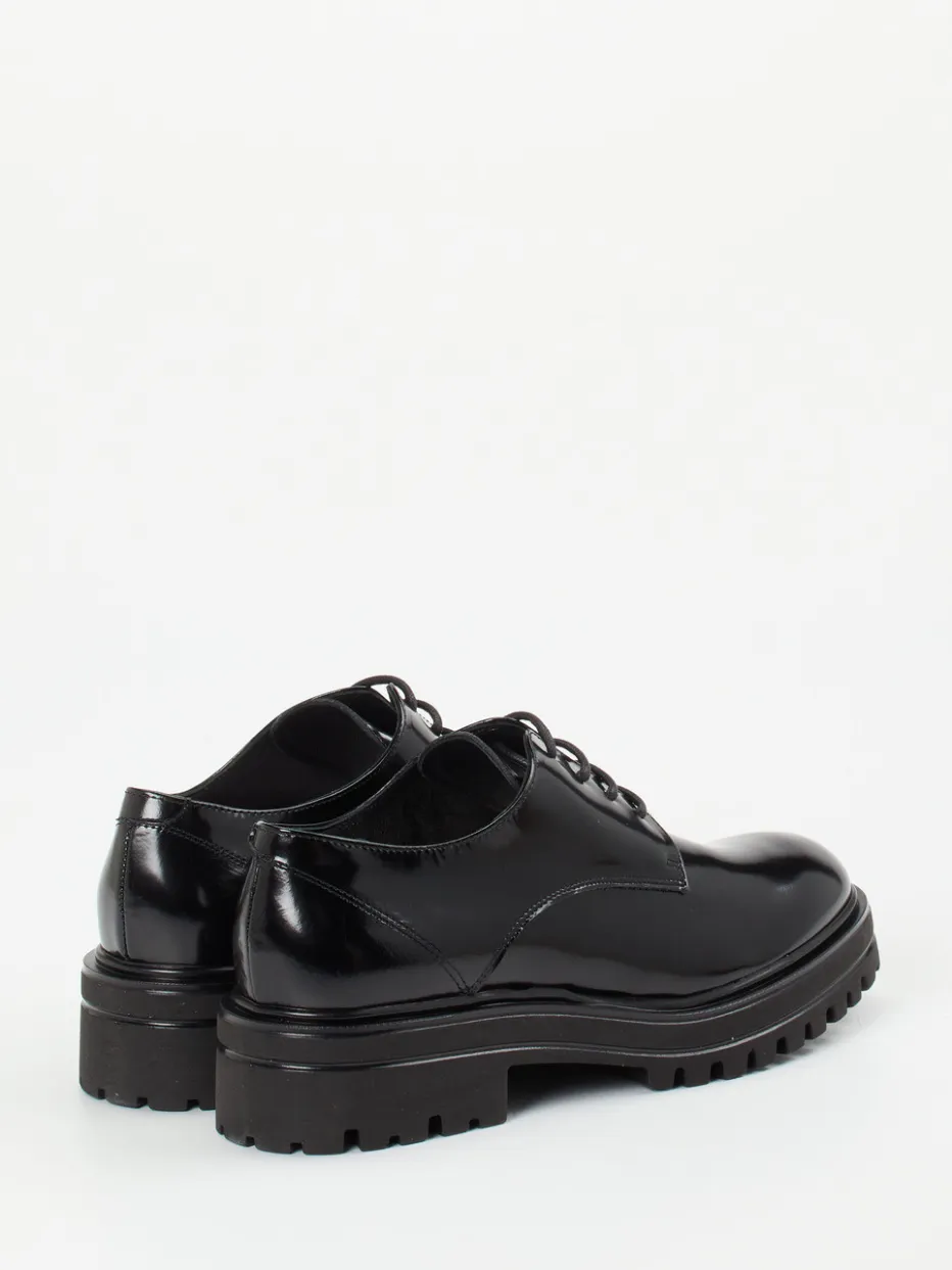 Dieser Derby-Schnürschuh vereint glänzendes Hochglanzleder mit einer markanten Profilsohle und interpretiert klassische Eleganz mit modernem Trendbewusstsein.