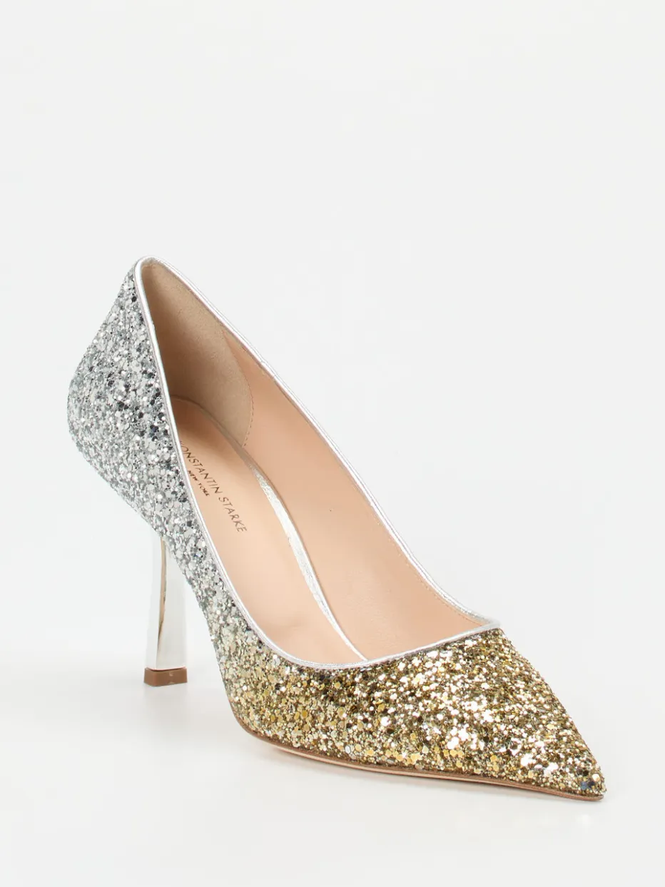 Glamour trifft auf Designstärke.Die Marke Konstantin Starke präsentiert stilvolle Damenpumps mit auffälliger Glamour-Note. Für den festlichen Auftritt am Abend oder Veranstaltungen mit stilvollem Dresscode konzipiert: Der High Heel überzeugt mit Metallic-Glitzertextil, ergänzt um einen silber-goldfarbenen Verlauf mit glänzender Oberfläche. Die spitz zulaufende Silhouette und der hochglänzende Metall-Absatz setzen ein ausdrucksstarkes Fashion-Statement. Innen sorgt ein Lederfutter für angenehmen Tragekomfort, während die Ledersohle elegante Linienführung unterstützt. Inspiriert vom Y2K-Revival, perfekt zum Metallic-Look mit Clutch und Statement-Accessoires. Ein Eyecatcher mit Markencharakter für trendbewusste Eleganz.