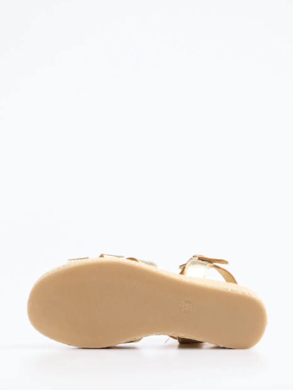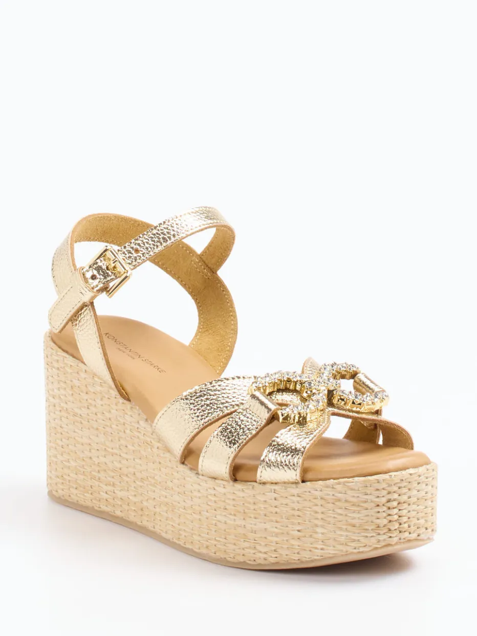 Goldschimmer für sonnige Anlässe.Die goldfarbene Keilsandale von Konstantin Starke bringt sommerliche Leichtigkeit mit glamouröser Raffinesse zusammen. Ob beim Dinner auf der Strandterrasse oder zur Party im Freien – das genarbte Metallicleder und funkelnde Strasssteine am Front-Riemen setzen elegante Akzente. Die breite Plateausohle in Bastoptik verleiht mediterranen Charme und sorgt für angenehme Laufhöhe bei stilvollem Auftritt. Ein verstellbarer Knöchelriemen mit Metallschließe sichert den Sitz, während die gummierte Sohle Halt bietet. Die keilförmige Silhouette passt perfekt zu fließenden Stoffen und hellen Sommerfarben. Modekompetenz mit hohem Designanspruch – typisch Konstantin Starke.