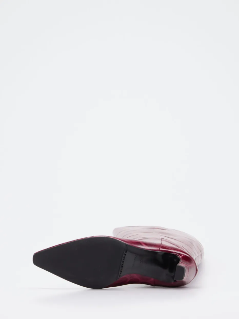 Stilvoll durch Herbst und Winter.Konstantin Starke interpretiert mit diesen kniehohen Damenstiefeln klassische Eleganz für die moderne Saison. Ideal für den stilvollen Alltag oder das Business-Outfit: Der tief bordeauxrote Stiefel besteht aus geprägtem Leder mit hochglänzender Krokoprägung – ein Statement in Struktur und Farbe. Die spitz zulaufende Front, der 5 cm hohe Blockabsatz und die gerade Schaftform betonen eine feminine Vintage-Linie mit minimalistischer Ton-in-Ton-Optik. Die glatte Gummisohle sorgt für Tragekomfort im urbanen Umfeld. Perfekt kombinierbar mit Mantel oder Hosenanzug. Ein ausdrucksstarkes Design mit luxuriösem Feingefühl – Konstantin Starke überzeugt mit moderner Klassik.