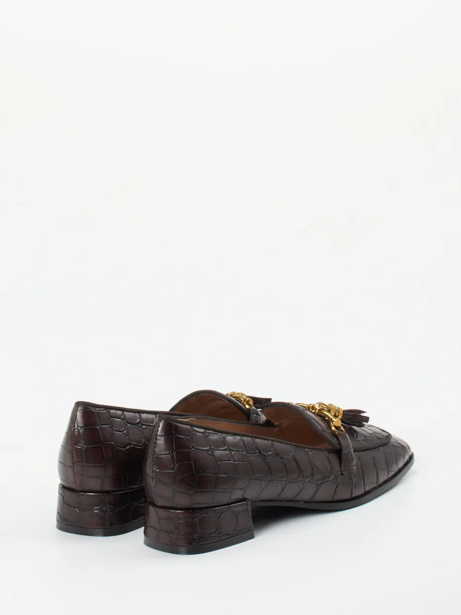 Dieser Damen-Loafer vereint glänzendes Krokoleder mit goldfarbener Zierspange und folgt dem Stilcode des ‚Quiet Luxury‘ – perfekt für elegante Looks mit Understatement.