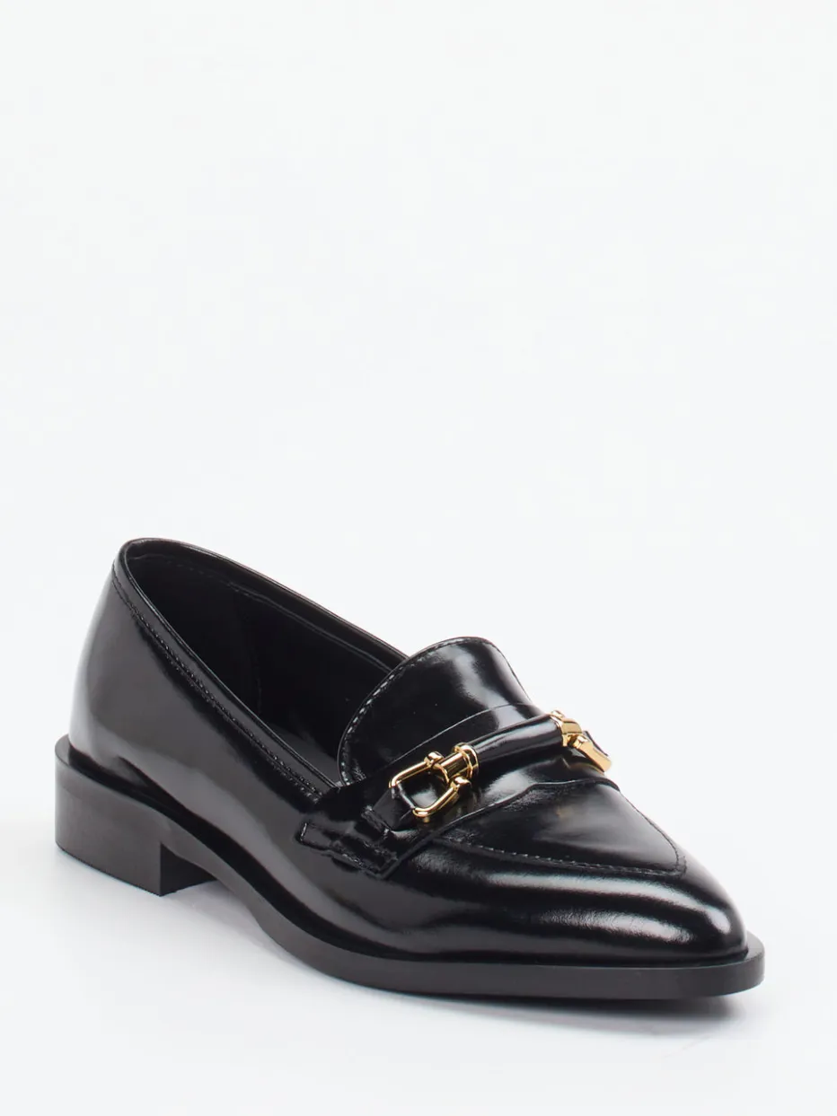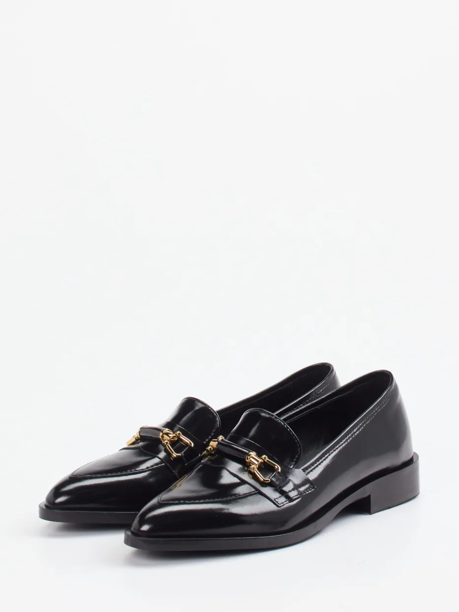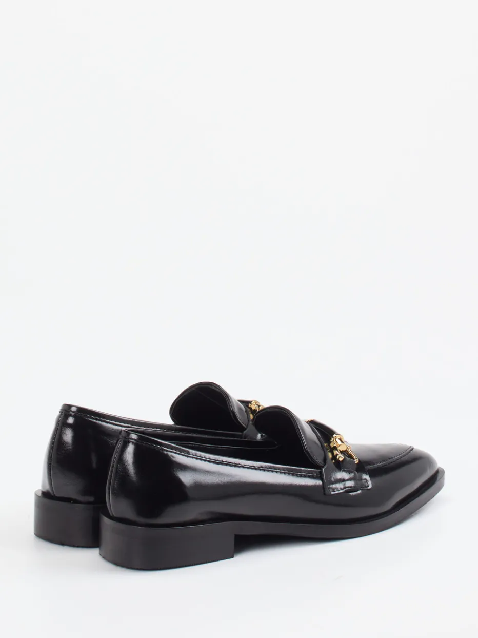 Der klassische Damen-Loafer überzeugt durch seine hochwertige Verarbeitung aus schwarzem Hochglanzleder und stilvolle Details wie die goldfarbene Kettenspange – elegant und vielseitig kombinierbar.
