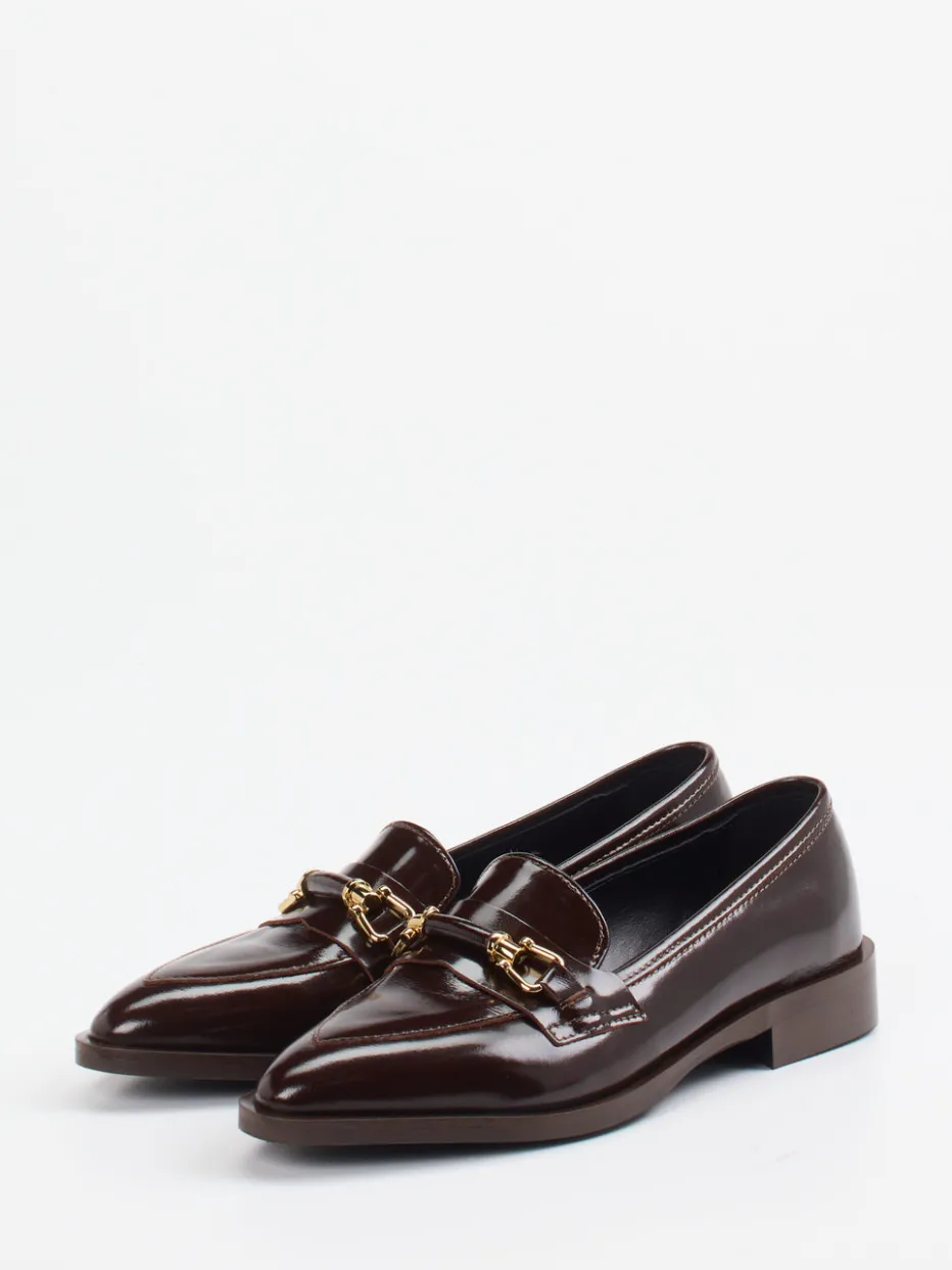 Konstantin Starke präsentiert mit diesem Loafer einen eleganten Damen-Slipper für Business und Alltag. Die schokoladenbraune Hochglanzoptik trifft auf eine klassisch-schmal zulaufende Silhouette, veredelt durch einen goldfarbenen Kettenschmuck und tonige Nähte. Aus hochwertigem Hochglanzleder gefertigt, bietet das Modell Komfort durch ein gepolstertes Kalblederfußbett und eine flexible Gummisohle mit flachem Blockabsatz. Die Slip-on-Form unterstreicht den minimalistischen Chic, während Mokassinnaht und glänzende Oberfläche dezente Heritage-Anklänge liefern. Gut kombinierbar mit Blazer oder Lederaccessoires. Ein Loafer mit souveräner Ästhetik und feinem Handwerksanspruch.