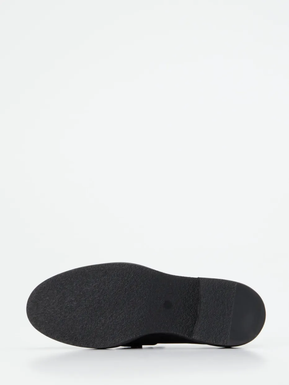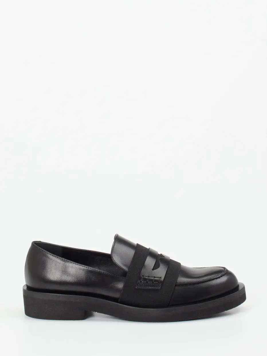 Gefertigt aus schwarzem Kalbleder mit matter Oberfläche, überzeugt der Loafer durch ein breites Elastikband mit aufgesetzter Ristspange. Die robuste Leichtzellsohle mit leichtem Profil sorgt für Trittsicherheit und Alltagstauglichkeit. Innen verspricht weiches Lederfutter angenehmen Tragekomfort. Das schnörkellose Design in Ton-in-Ton-Nähung spricht eine minimalistische Formensprache und greift den „Quiet Luxury“-Trend auf. Kombinierbar zu Klassikern wie Blazer und Satchel Bag.