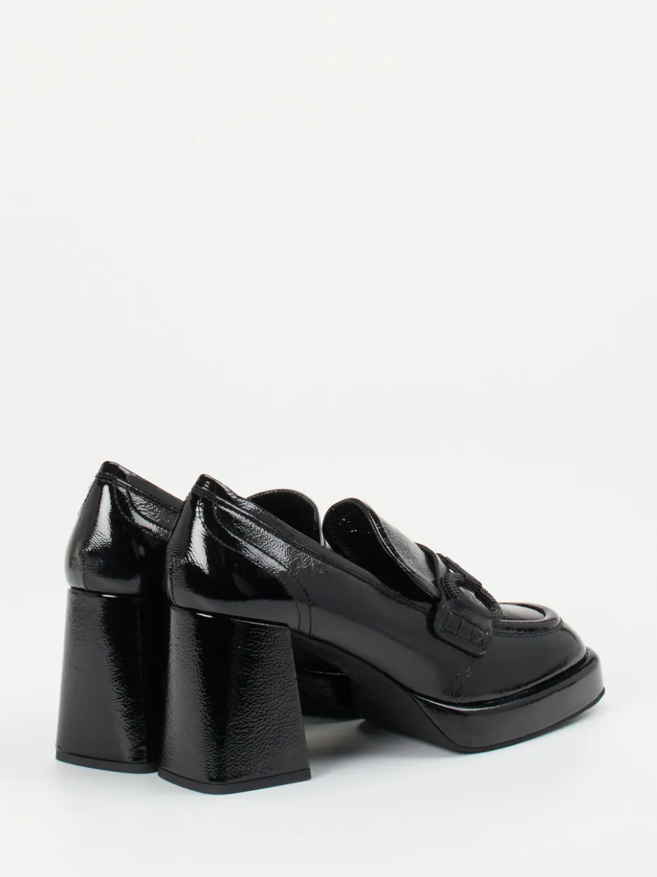 Für stilbewusste Bürolooks oder Anlässe mit modischem Anspruch bietet der schwarzer Lackleder-Loafer mit glänzender Oberfläche eine ausdrucksstarke Option. Die tonige Textilschleife auf dem Blatt setzt einen femininen Akzent, während die klassische Silhouette durch den lederbezogenen 7 cm Blockabsatz an Retro-Chic gewinnt. Gummisohle und gepolstertes Lederfußbett sorgen für angenehmen Komfort im Alltag. Der Schlupfschuh vereint leisen Luxus und aktuelles Trendbewusstsein.