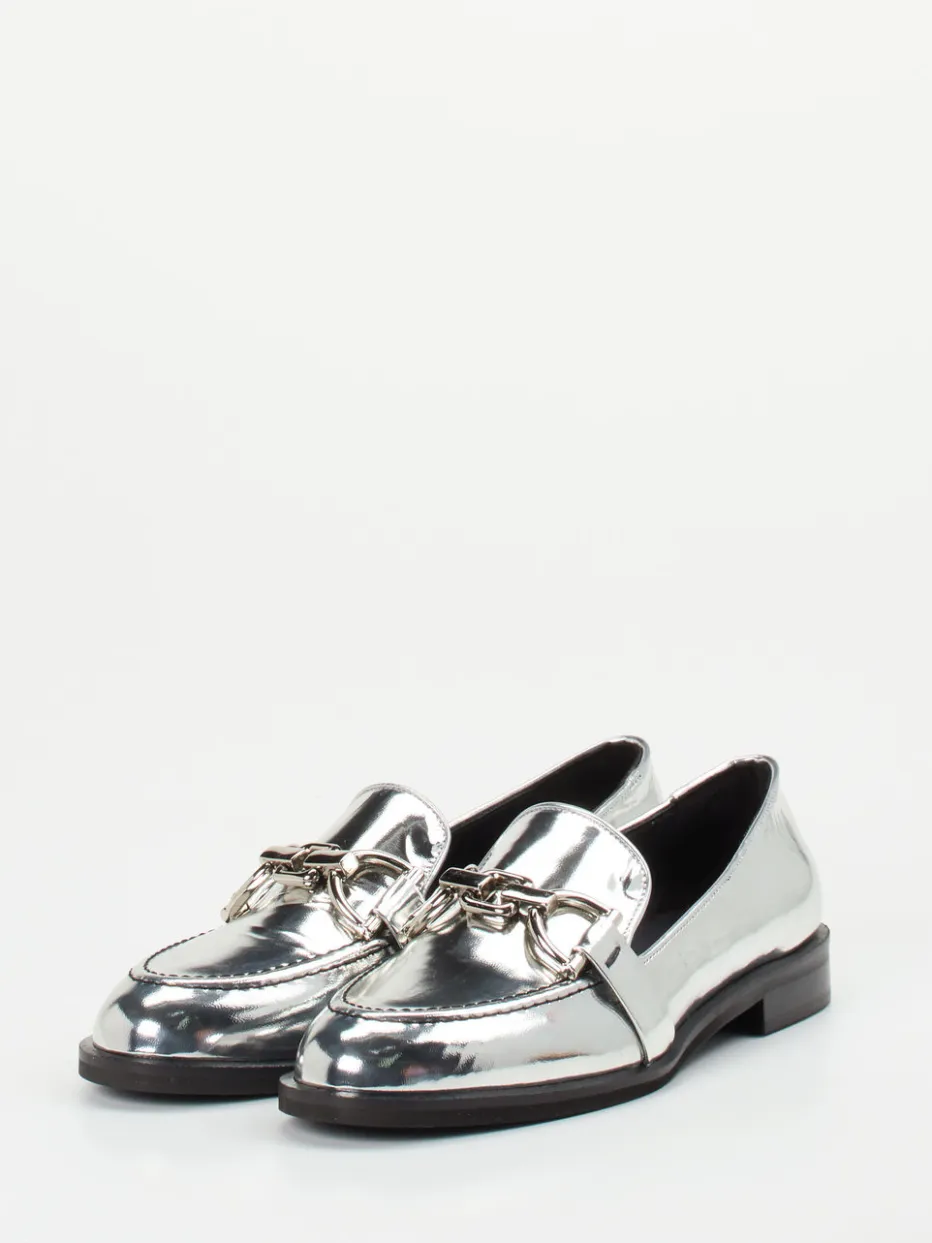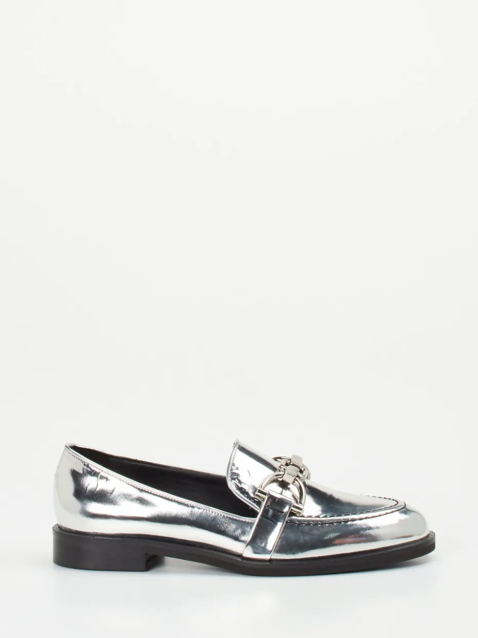 Der schimmernde Loafer interpretiert klassische Formgebung mit einem futuristisch-glänzenden Finish neu. Als Stilstatement verbindet er modische Klarheit mit markanter Ketten-Applikation.