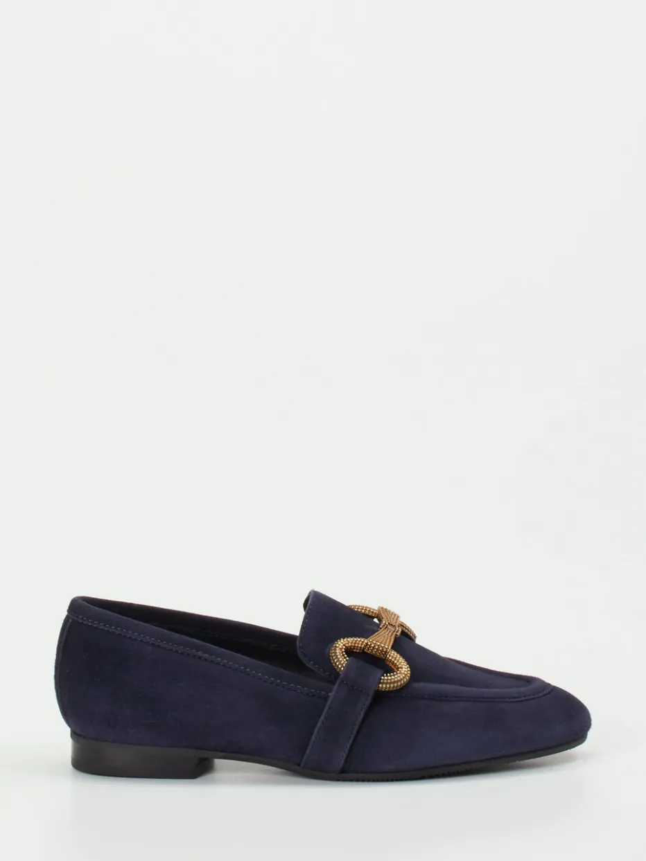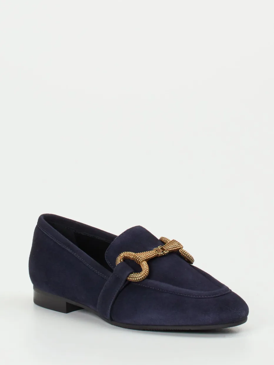 Ob im Büro oder in der Freizeit – das dunkelblaue Veloursleder mit matter Oberfläche und samtiger Textur sorgt für einen souveränen Auftritt. Die goldfarbene Zierspange im Trensenstil setzt einen dezenten Akzent, der den Preppy Chic betont. Dank Gummisohle und Ziegenlederfutter bietet das Modell komfortable Laufeigenschaften. Der flache Absatz und die Schlupfform unterstreichen den Heritage-Look im Sinne des „Quiet Luxury“-Trends. Perfekt kombinierbar mit Kaschmirpulli und Leder-Tote.