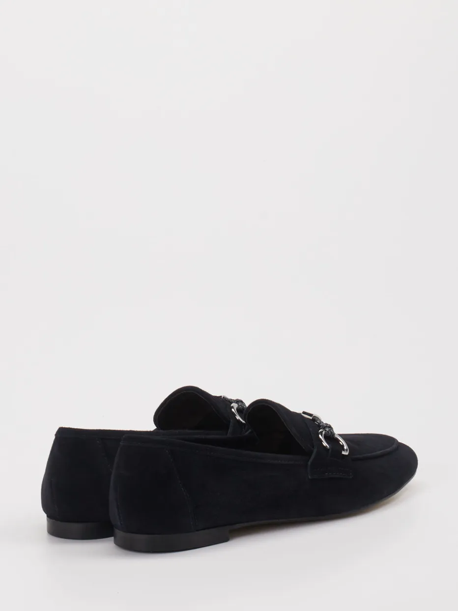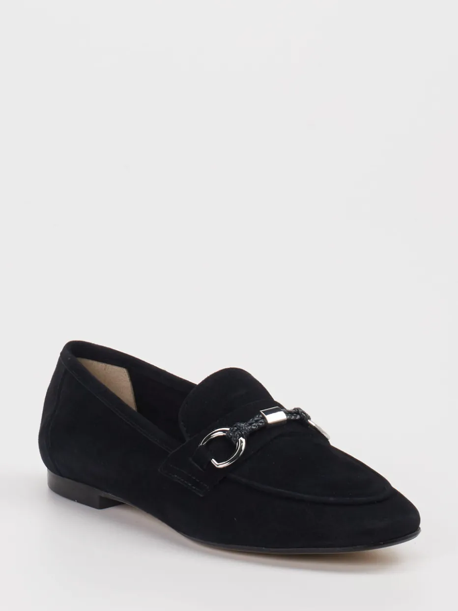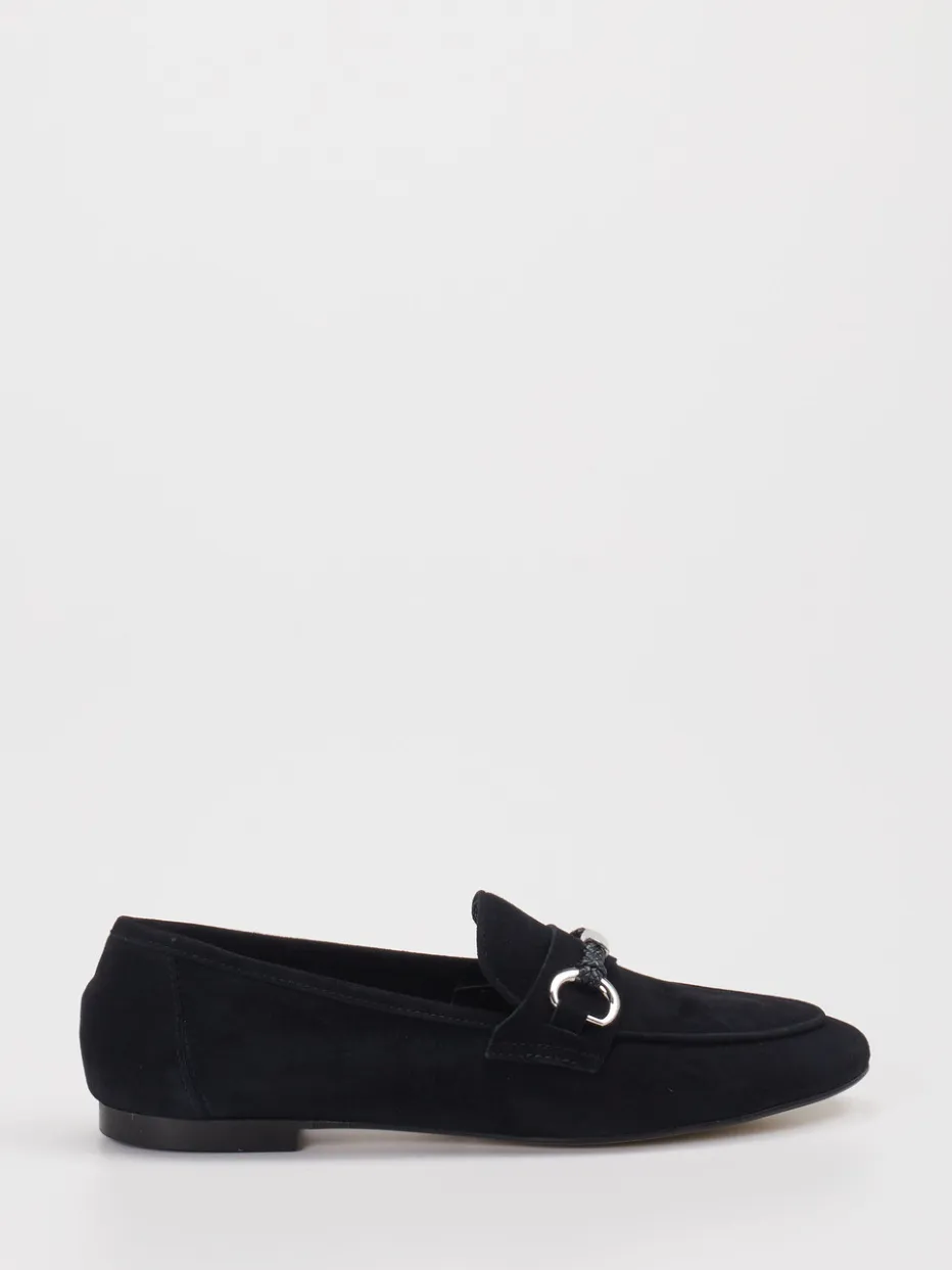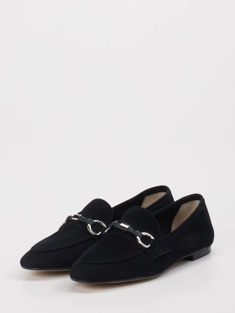 Eleganter Damen-Loafer aus schwarzem Veloursleder mit silberfarbener Spange – ein stilvoller Begleiter für minimalistische Looks im Büro und Freizeitalltag.