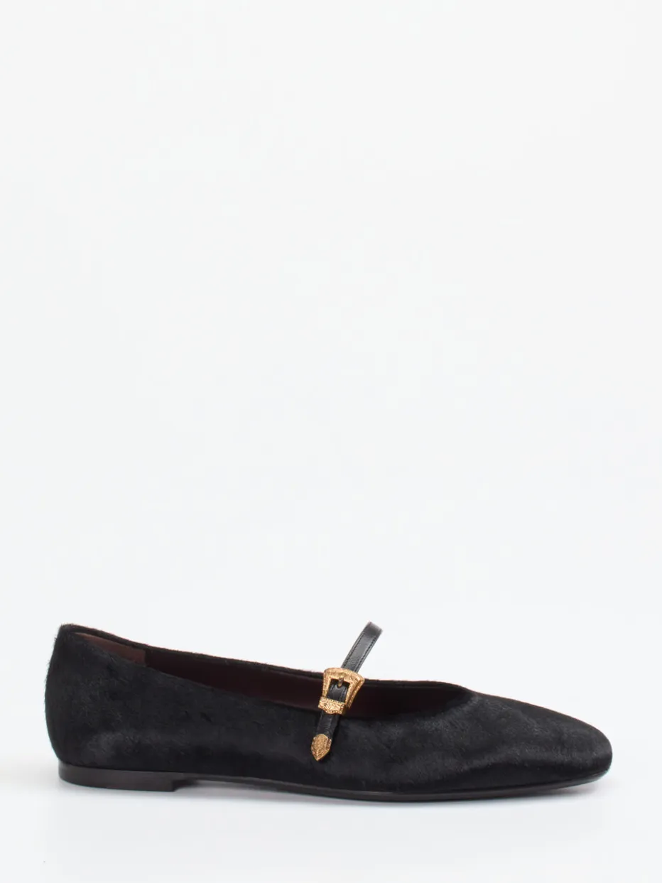 Die klare Silhouette und das strukturierte Obermaterial aus Fell verleihen diesen Mary Jane Ballerinas eine elegante Noblesse mit modernem Vintage-Flair.
