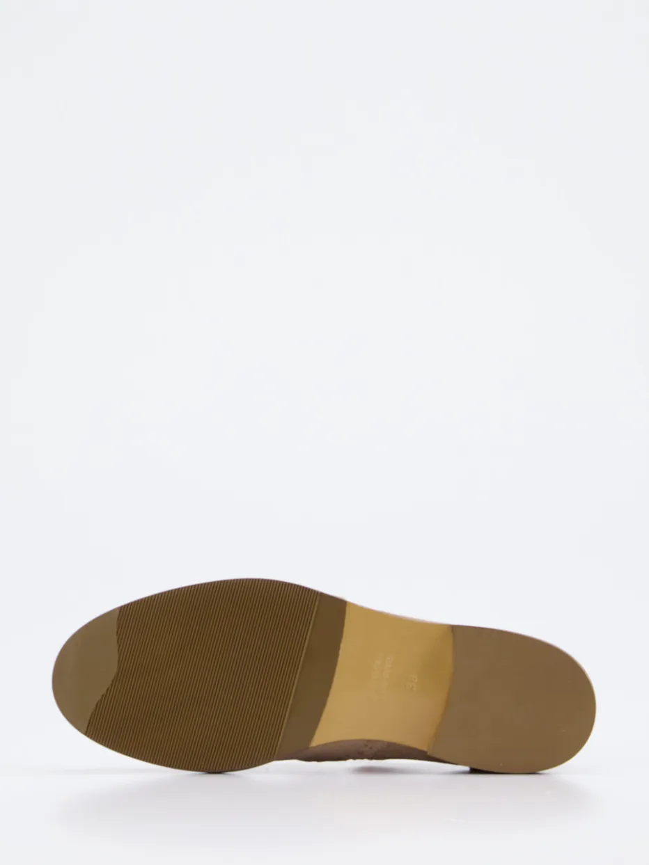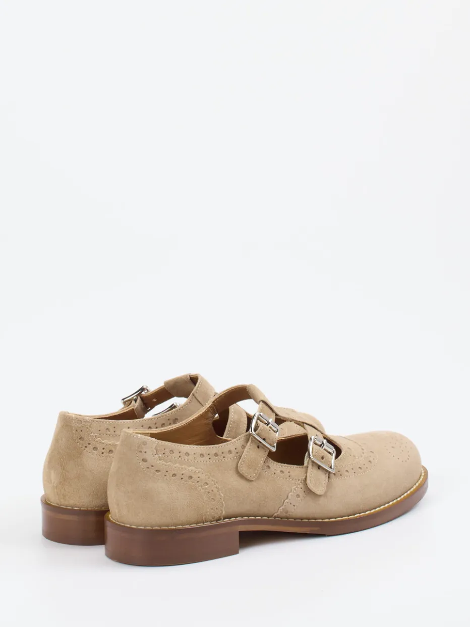Preppy-Update mit Retro-Charme.Konstantin Starke interpretiert den klassischen Damenhalbschuh neu. Für stilvolle Tage im Büro oder elegante Freizeitmomente: Das beigefarbene Veloursleder ist samtig angeschliffen und trägt Lyralochung im Brogue-Stil. Zwei silberfarbene Schnallen sorgen für perfekten Sitz, während die matt strukturierte Oberfläche und die abgerundete Silhouette dem Schuh ein preppy Finish verleihen. Der flache Bau und das dezente Profil der Gummisohle bieten Komfort – ganz im Zeichen von Quiet Luxury. Ideal zu Trenchcoat und Ledertasche. Ein femininer Klassiker, der Stilgefühl und moderne Zurückhaltung vereint.