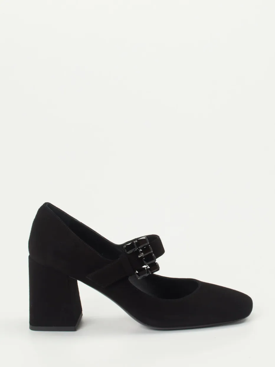 Diese Pumps verbinden edles Veloursleder mit einem femininen Retro-Design. Die funkelnde Schmuckschließe setzt einen dezenten, luxuriösen Akzent.