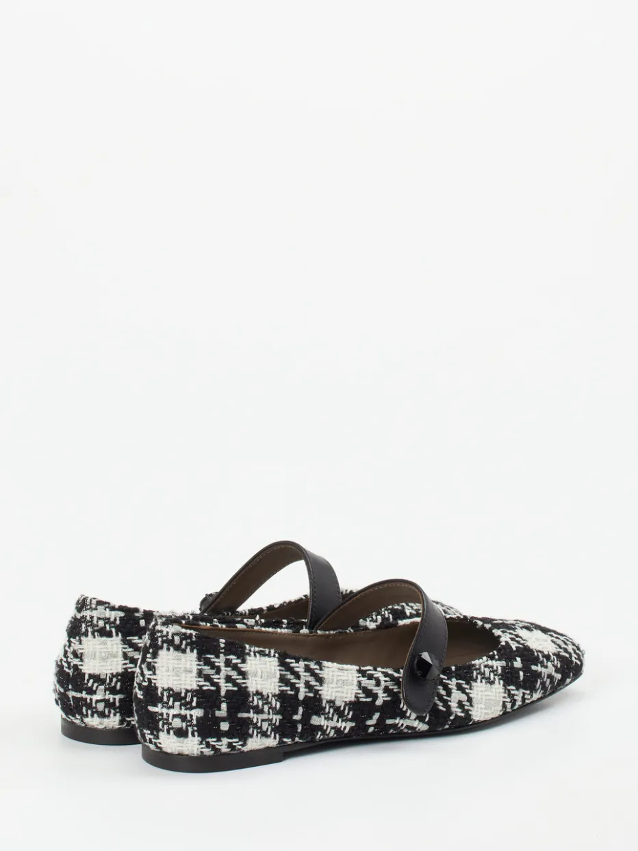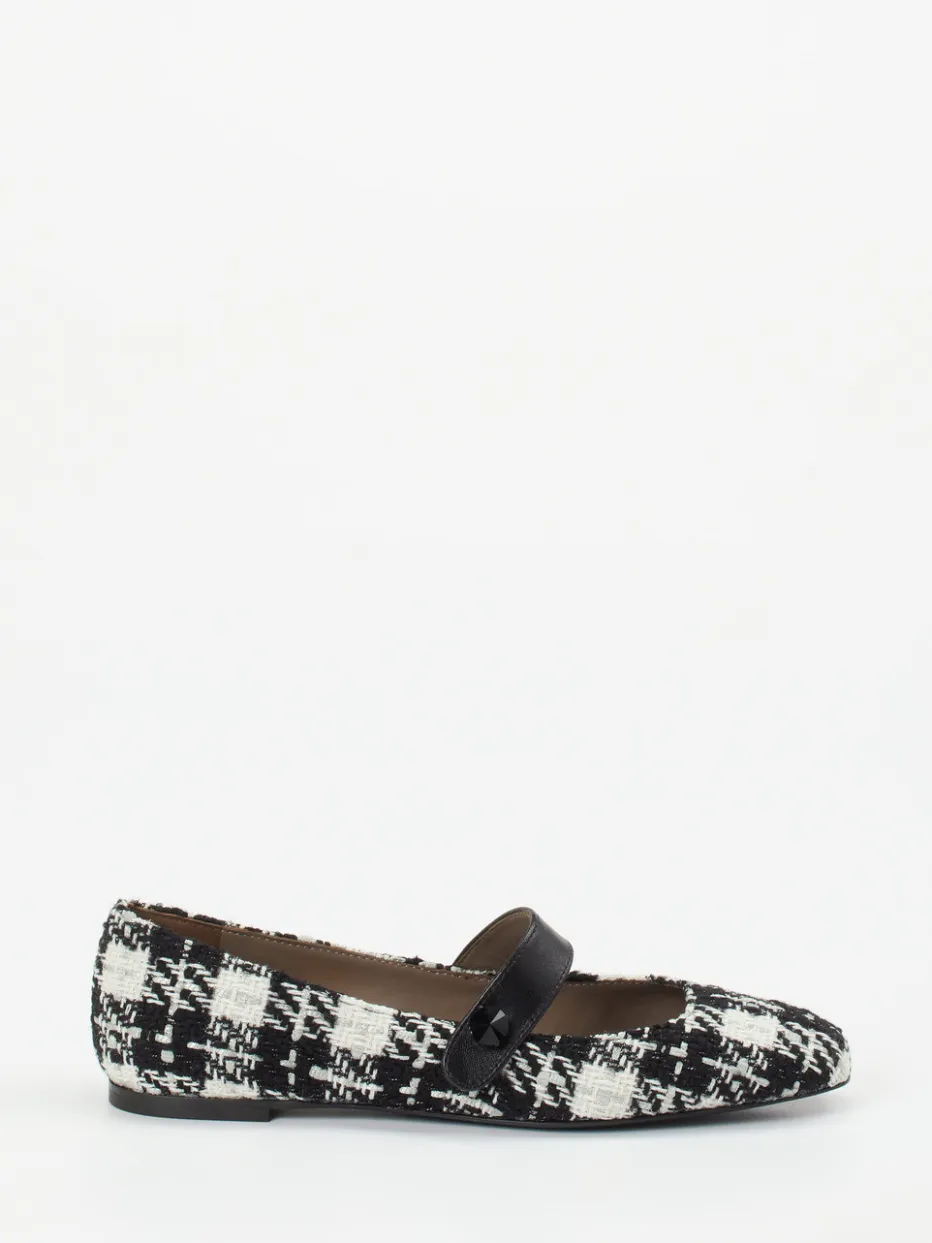 Modern interpretierter Vintage-Stil.Konstantin Starke interpretiert die klassische Ballerina unter nostalgischem Einfluss neu. Ideal für festliche Anlässe oder elegante Alltagskombinationen überzeugt dieses Modell mit strapazierfähigem Obermaterial aus grob gewebtem Bouclé-Textil im schwarz-weißen Karomuster. Der flache Aufbau mit leicht spitz zulaufender Form, kombiniert mit einem markanten Spannriemen aus schwarzem Kalbleder und tonigem Zierknopf, lässt französische Chic-Referenzen erkennen. Die Innenausstattung ist vollständig aus weichem Kalbleder gearbeitet, während die Lederlaufsohle mit Gummieinsatz Sicherheit im Alltag bietet. Die dezente Chanel-Ästhetik und der Bezug zum