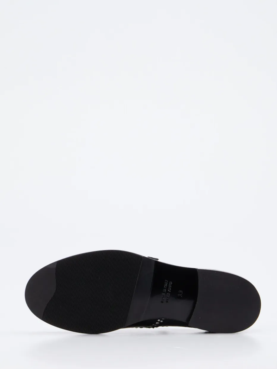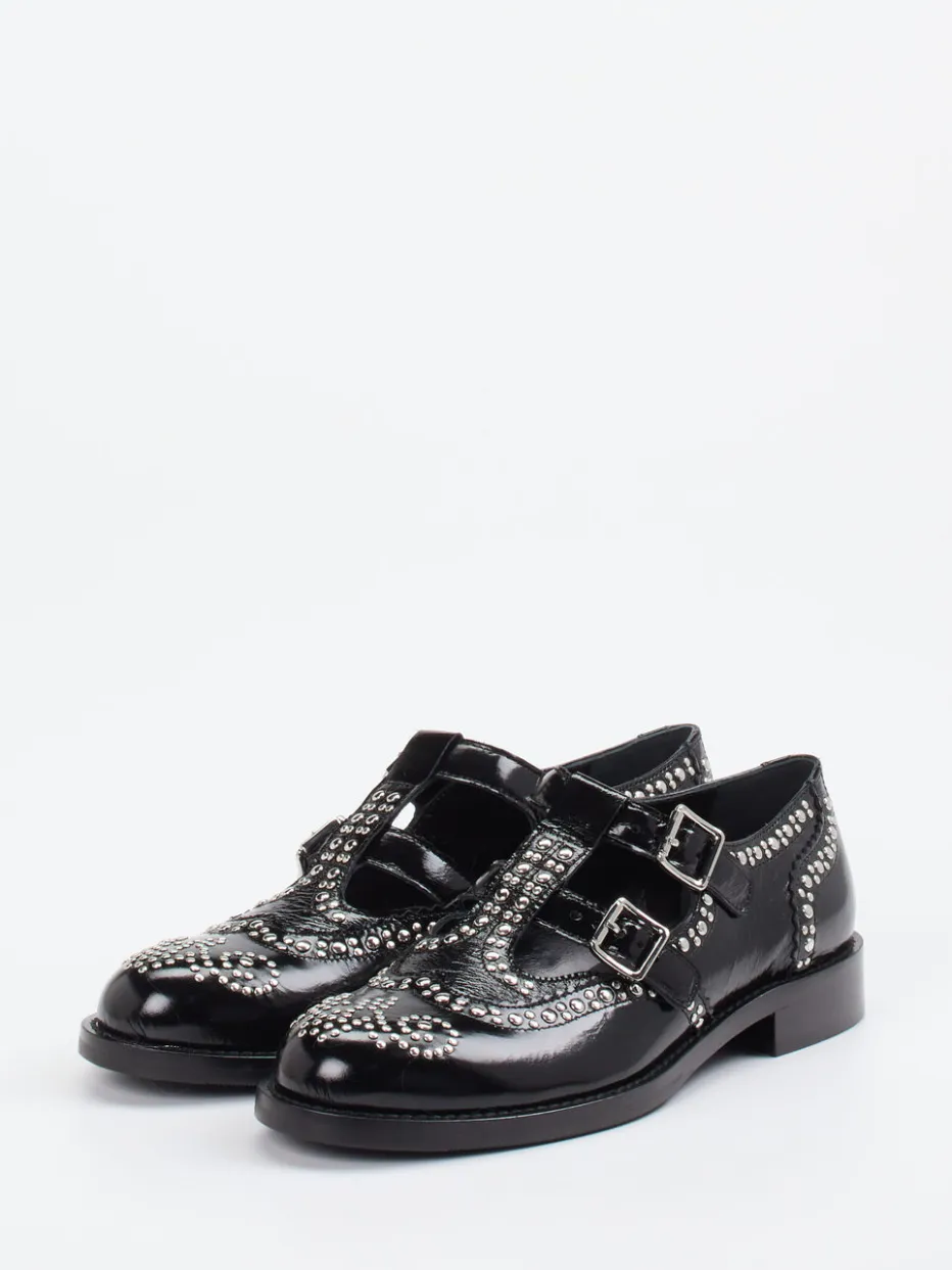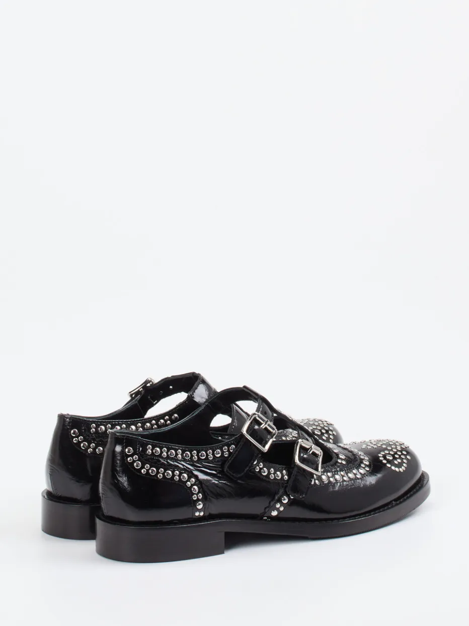 Ob beim Stadtbummel oder abends im Szeneviertel – das hochglänzende Lackleder in tiefem Schwarz bietet eine elegante Grundlage mit rebellischem Touch. Silberfarbene Nieten und doppelte Schnallen setzen auffällige Akzente. Die flache, rund zulaufende Form sorgt dabei für Komfort, der durch die rutschfeste Gummisohle unterstützt wird. Stilistisch vereinen sich Punk-Elemente und klassische Brogue-Anklänge zu einem Fashion-Statement mit Trendgespür. Ideal zu strukturierten Stoffen oder rockigen Lederjacken.