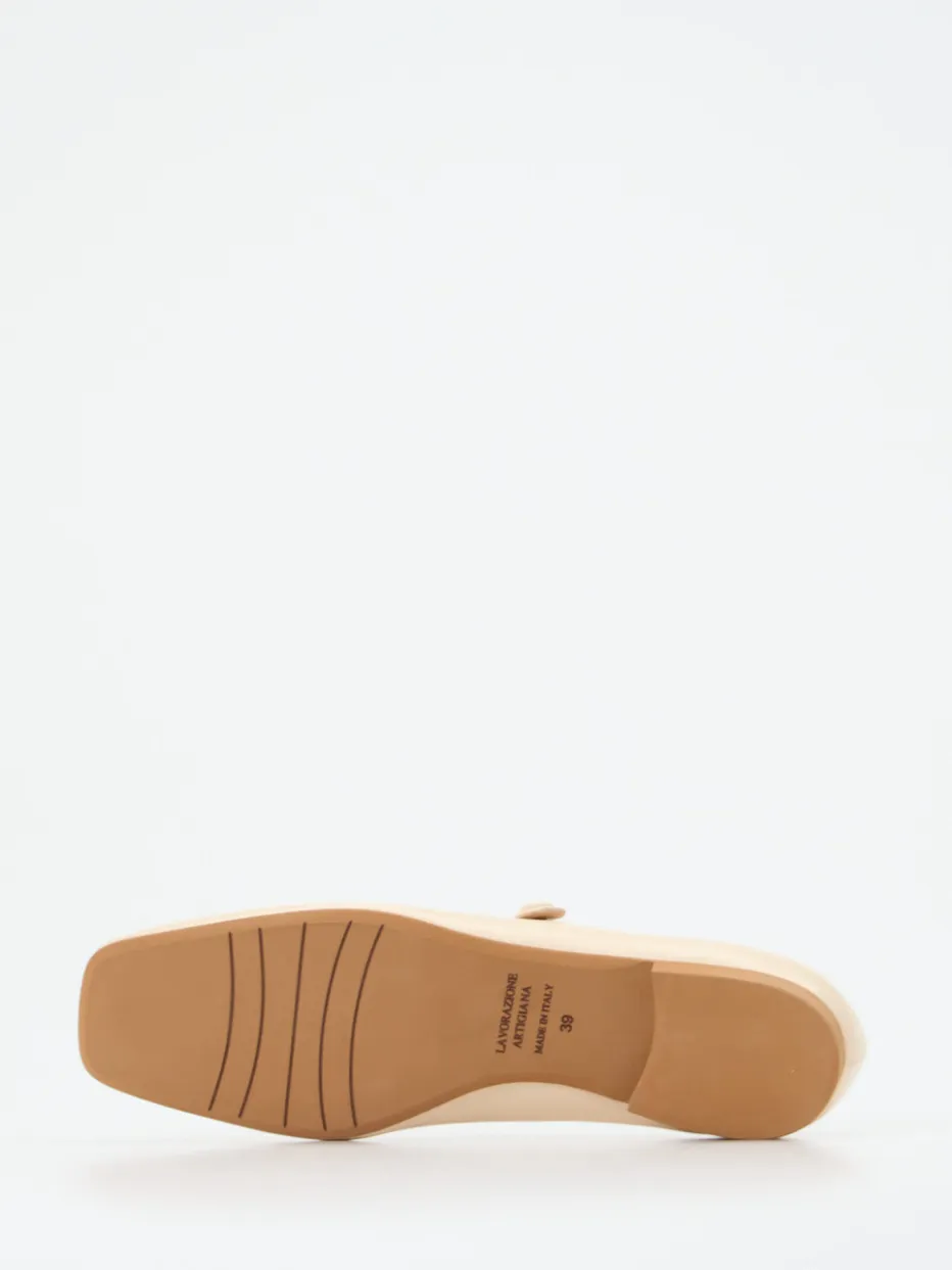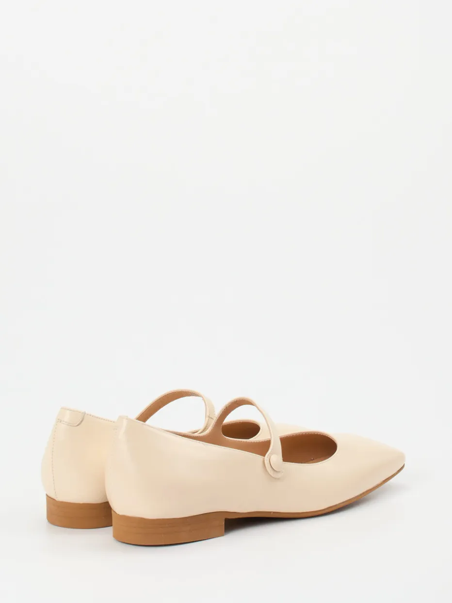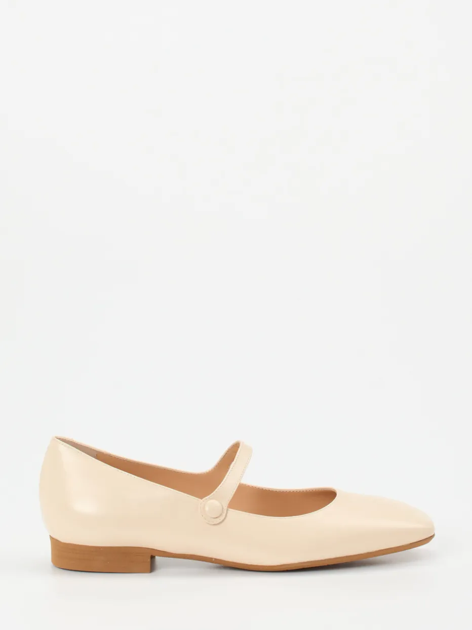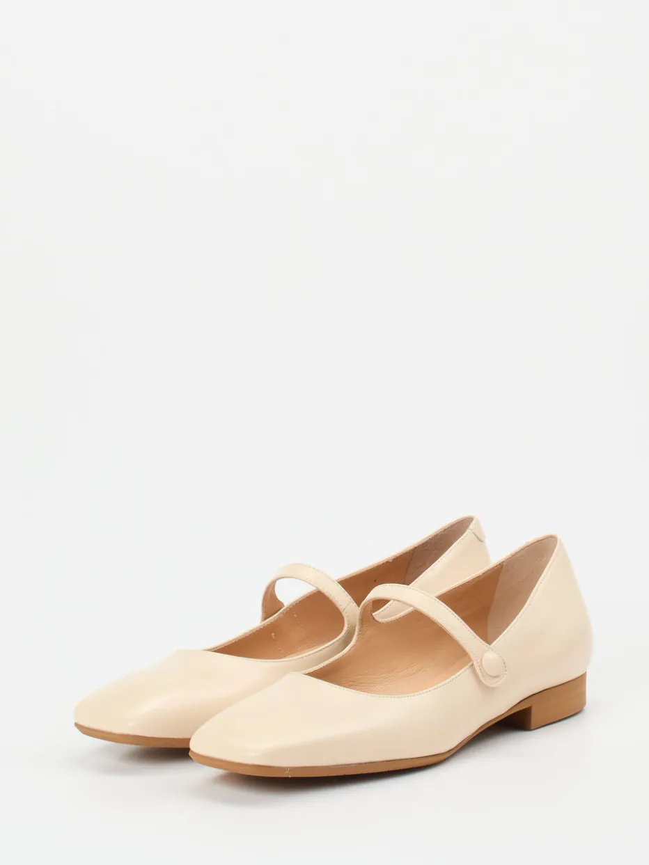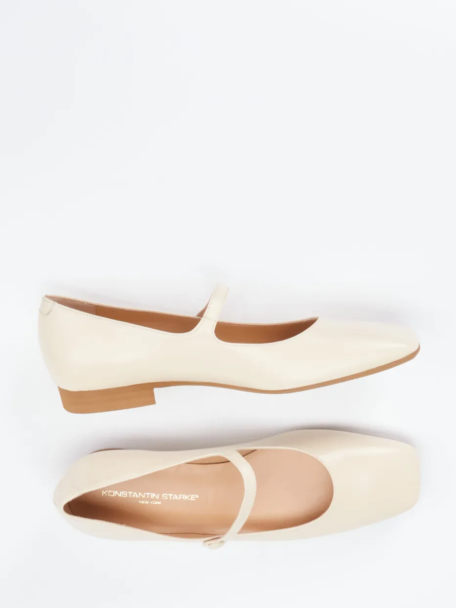 Zeitloser Chic in sanftem Glanz.Konstantin Starke präsentiert stilvolle Damen-Mary-Janes in beigefarbenem Lammleder auf klassischer Carré-Leiste. Ideal für Büro und Alltag verbinden sie glänzend verarbeitetes Glattleder mit einer flachen, holzfarbenen Laufsohle aus Gummi. Der dezente Riemen mit Knopfverschluss unterstreicht den Vintage-Charakter und setzt ein klares modisches Statement zwischen „Balletcore“ und „Quiet Luxury“. Die Silhouette bleibt klassisch flach und minimalistisch, während das weiche Kalblederfutter für Tragekomfort sorgt. In Kombination mit einem Midirock wird der Retro-Touch elegant betont. Ein Modell für stilvolle Leichtigkeit und dezente Detailverliebtheit.