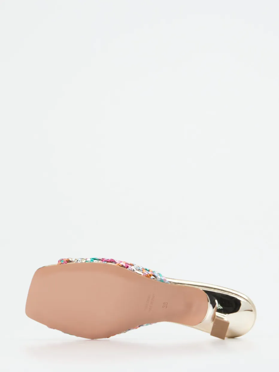 Glänzende Akzente und sommerliche Farbtöne treffen in dieser Pantolette auf feminine Eleganz. Das geflochtene Flechtleder kombiniert Y2K-Vibes mit einem modernen Silhouettenkonzept.