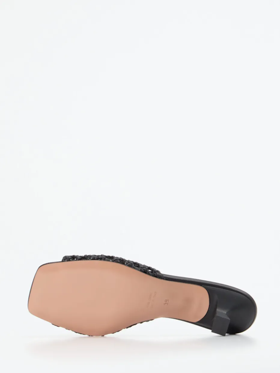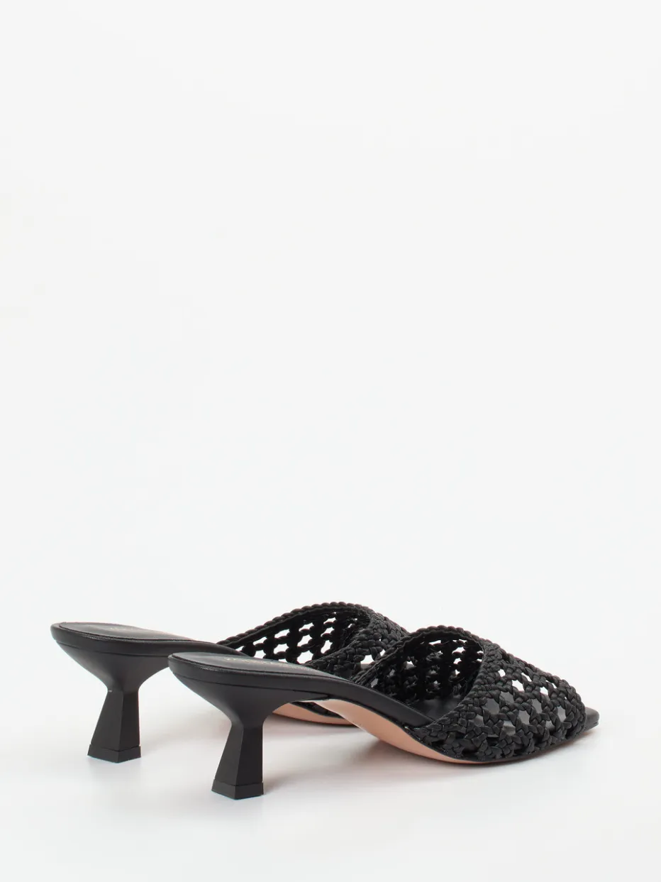 Die elegante Pantolette verbindet fein geflochtenes Leder mit einer minimalistischen Silhouette. Der geometrische Kitten Heel verleiht dem Modell stilvolle Y2K-Ästhetik.
