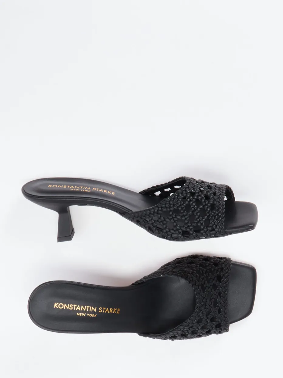 Sommer-Eleganz trifft klare Kontur.Die Damen-Mules von Konstantin Starke verbinden luftiges Flechtleder mit modernem Chic. Ideal für stilvolle Abende oder entspannte Sommertage: Die Pantolette in tiefem Schwarz präsentiert sich mit offenem Schnitt, eckiger Zehenpartie und dezenter Carréleisten-Silhouette. Das weich gepolsterte lederbezogene Fußbett sorgt für angenehmen Tragekomfort, der geometrisch geformte Kitten Heel streckt dezent das Bein. Ton-in-Ton gearbeitet, betont die matte Oberflächenstruktur den zurückhaltenden Luxus-Look, inspiriert vom Quiet-Luxury-Trend mit einem Hauch 90s-Charme. Kombinierbar zu fließenden Sommerkleidern oder minimalistischen Abendoutfits. Fein gearbeitete Flechtstruktur mit Stilbewusstsein von Konstantin Starke.