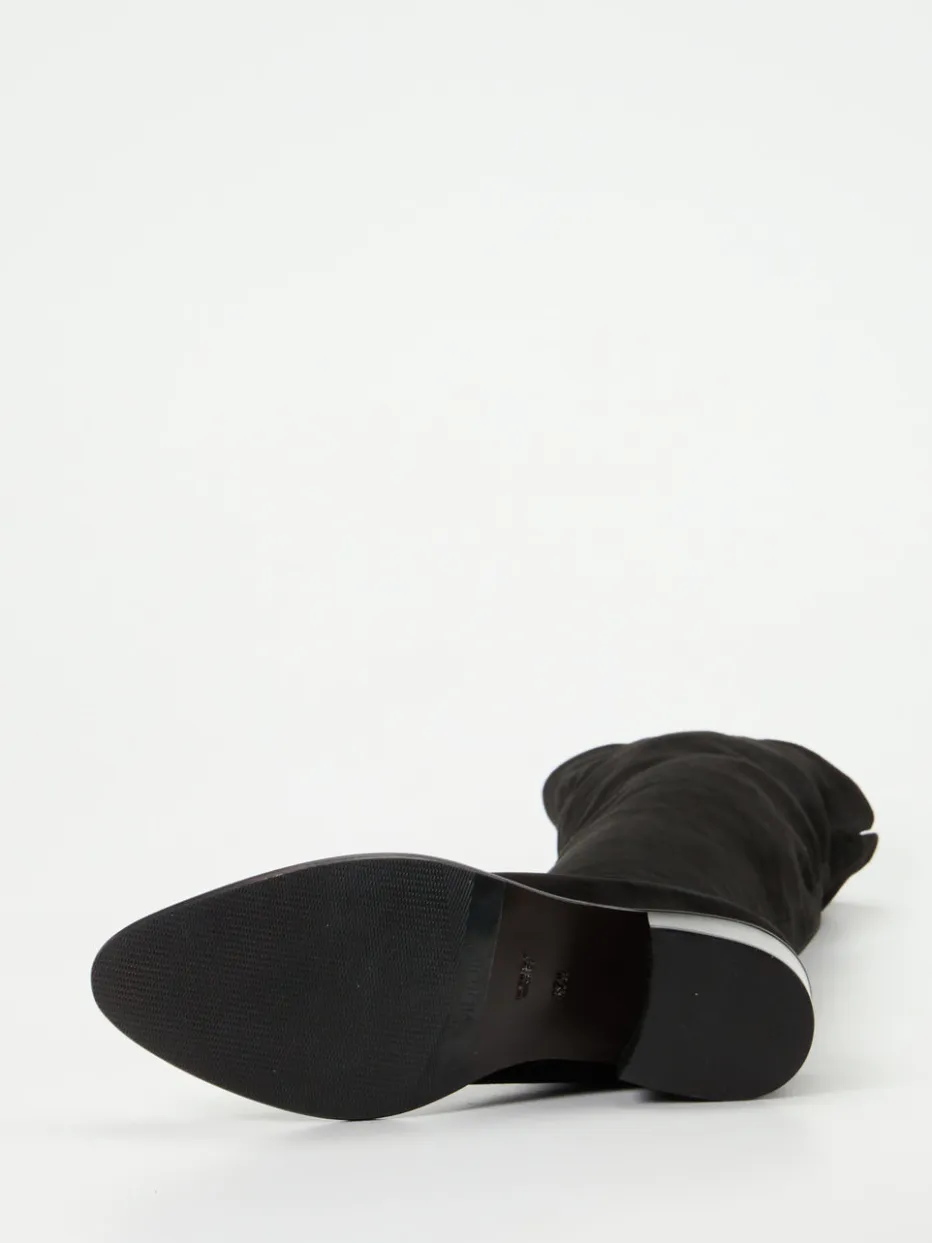 Puristisches Design trifft auf luxuriöse Verarbeitung – dieser Overknee-Stiefel überzeugt durch edles Lammleder, klare Linienführung und modernen Blockabsatz.