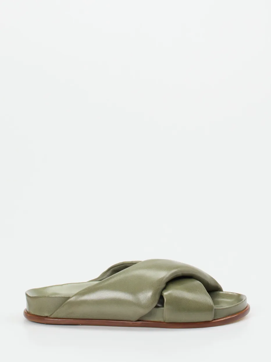 Sommer-Chic in neuer Leichtigkeit. Mit dieser Pantolette interpretiert Konstantin Starke die Kategorie Slides stilvoll neu. Ideal für warme Tage in der Stadt oder auf Reisen bietet dieses Modell hohen Komfort und modischen Minimalismus. Gefertigt aus weichem Lammleder in Salbeigrün wirken die überkreuzten, gepolsterten Riemen voluminös und edel. Das anatomisch geformte Lederfußbett und eine leicht erhöhte Sohle mit braunem Akzent sorgen für ein stimmiges Gesamtbild und angenehmes Tragegefühl. Der Look greift aktuelle Trends wie „Soft Volume“ und „Quiet Luxury“ auf. Kombinierbar mit Leinenhose und Oversized-Bluse. Feine Handwerkskunst trifft zurückhaltende Eleganz – für designbewusste Sommertage.