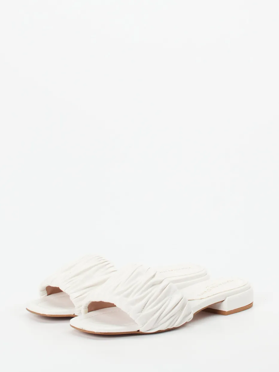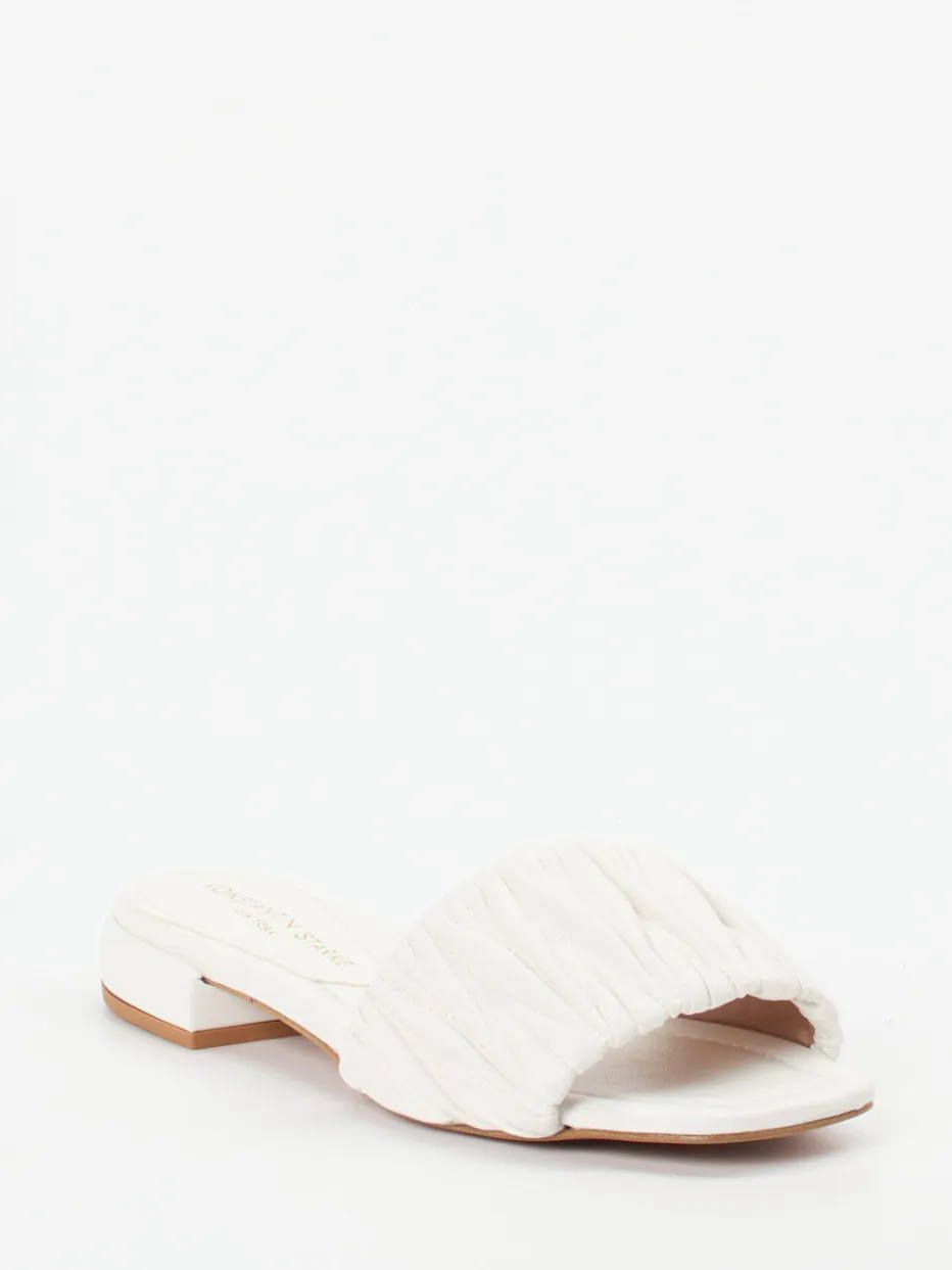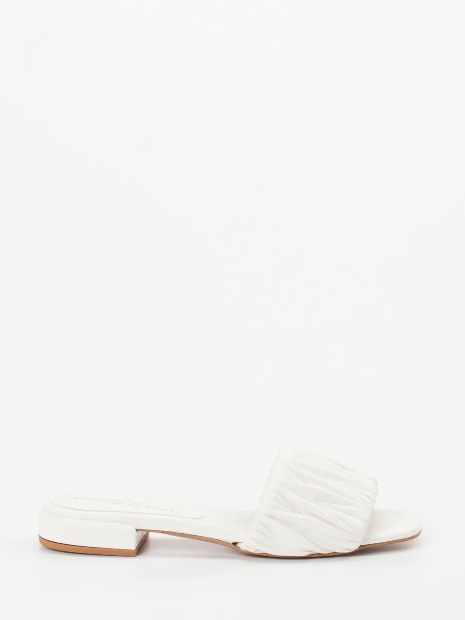 Minimalistische Raffinesse für warme Tage.Konstantin Starke präsentiert hier eine modisch inspirierte Damenpantolette. Für urbane Sommertage oder den entspannten Urlaubsstil bietet dieses Modell mit synthetischem Obermaterial in Lederoptik und gefältelter Riemenstruktur sowohl Komfort als auch Raffinesse. Die tonige Farbgebung in Offwhite betont das cleane Design, das durch die kantige Zehenpartie und den flachen Blockabsatz modern konturiert wird. Ohne Verschluss gestaltet, lässt sich die Slide-Sandale schnell an- und ausziehen. Stilistisch verankert im „Quiet Luxury“-Trend ist sie vielseitig kombinierbar – etwa zu Leinenkleidern oder Naturtönen. Markentypisch verbindet sie feminine Eleganz mit hochwertigem Tragegefühl.