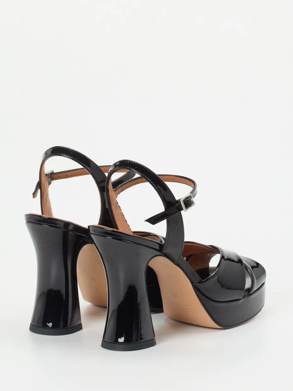 Diese Plateau-Sandalette kombiniert retro-inspirierte Formgebung mit glänzendem Lackleder und hoher Plateauabsatz-Silhouette – ein Highlight für stilbewusste Auftritte am Abend.