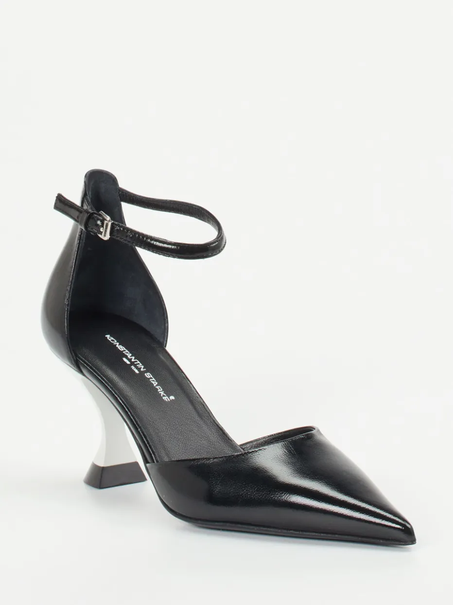 Avantgarde im Abendstil.Die Marke Konstantin Starke interpretiert klassische Pumps neu und kombiniert elegantes Design mit futuristischen Elementen. Für stilbewusste Auftritte bei festlichen Anlässen oder Events: Diese Ankle-Strap-Pumps aus glänzendem Kalbleder präsentieren sich in edlem Schwarz, ergänzt durch eine skulpturale Zweifarb-Absatzarchitektur in Schwarz und Weiß. Die spitz zulaufende Silhouette erzeugt eine feminine Linie, während Riemchen mit silberfarbener Schnalle den Look definieren. Der Absatz von 7 cm sorgt für eine harmonische Höhe und unterstützt mit dem gepolsterten Fußbett angenehmen Tragekomfort. In der aktuellen SS24-Trendlinie „Sculptural Heels“ verortet. Ein markantes Stilstatement mit modischer Intelligenz, wie es für Konstantin Starke typisch ist.