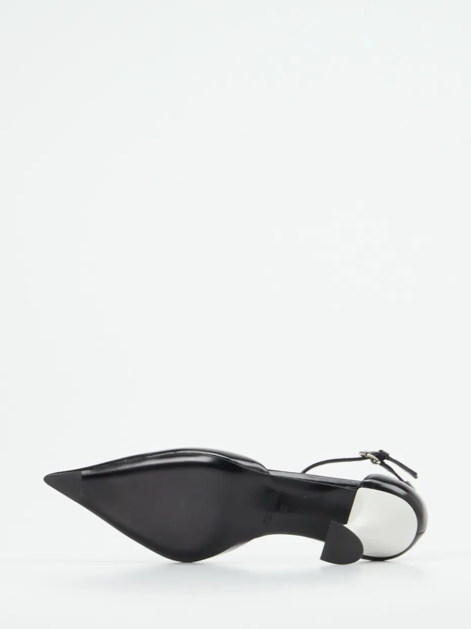 Der skulpturale Absatz verleiht dem Modell eine markante High-Fashion-Note, verstärkt durch glänzendes Kalbleder und minimalistisches Design.